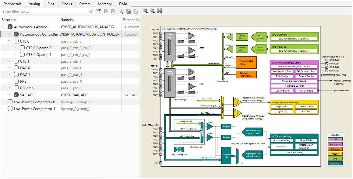 tab allows you to enable and configure the various analog resources in your application. The filter box and the hide disabled button above the list of resources allows you to limit the items shown in the tree. This tab allows you to enter one or more