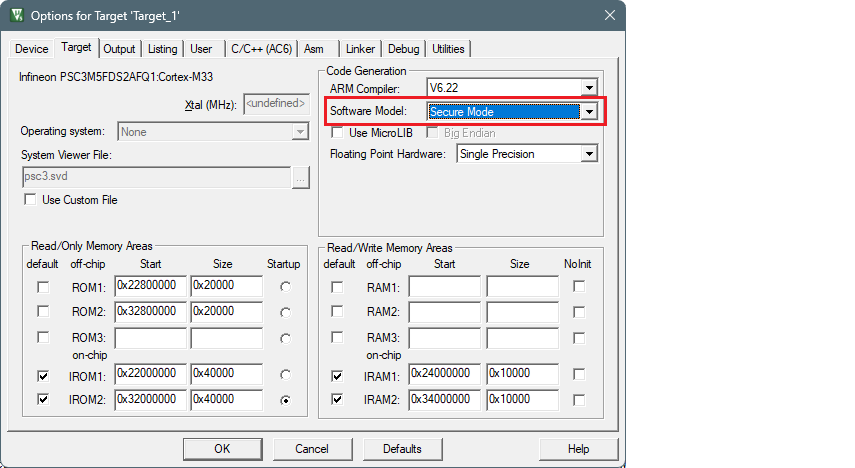 The project is an ARM Trustzone secure project. The following need to be enabled in UVision IDE: