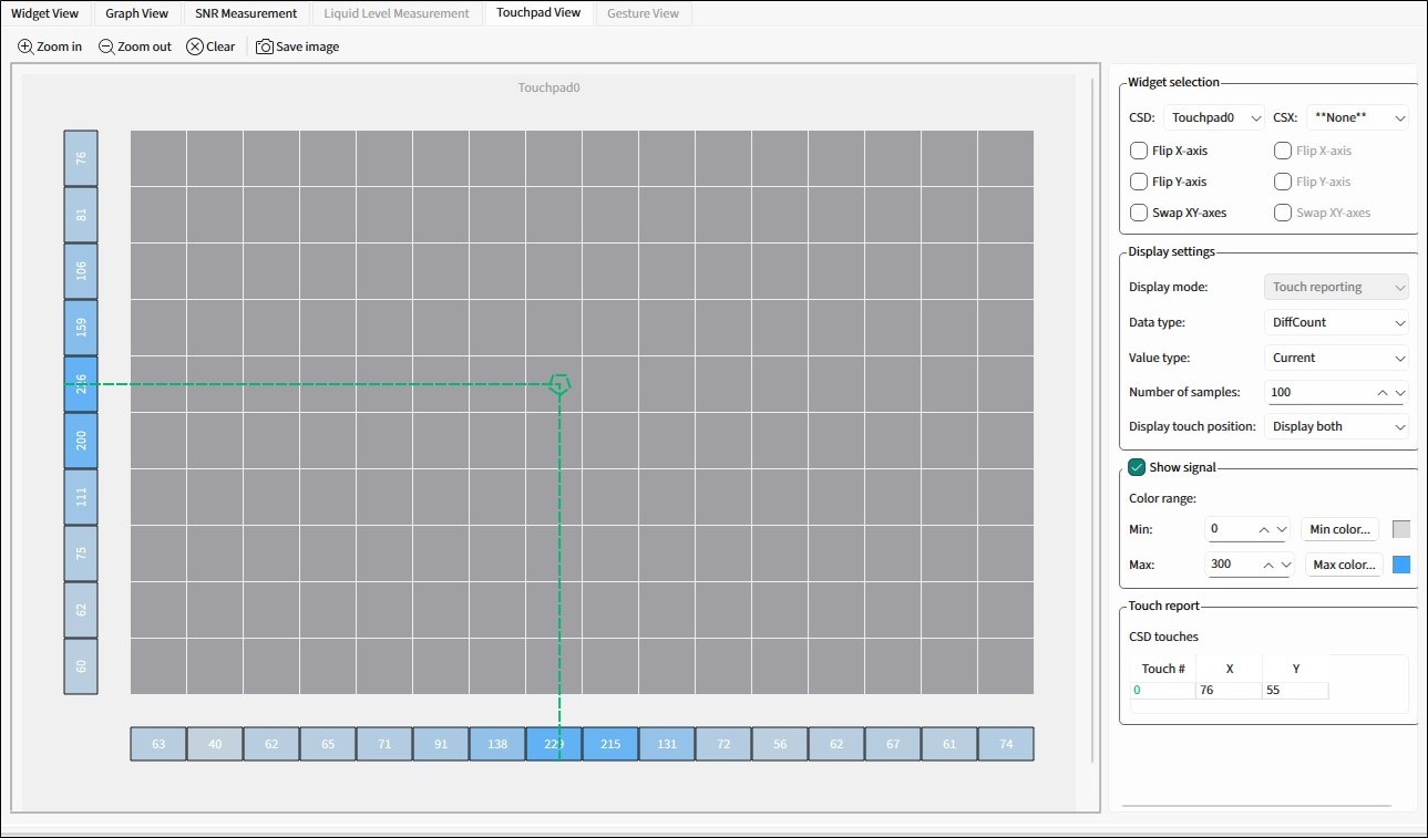 This tab visually represents signals and positions of a selected touchpad widget in the heatmap form. Only one CSD and one CSX touchpad can be displayed at a time.