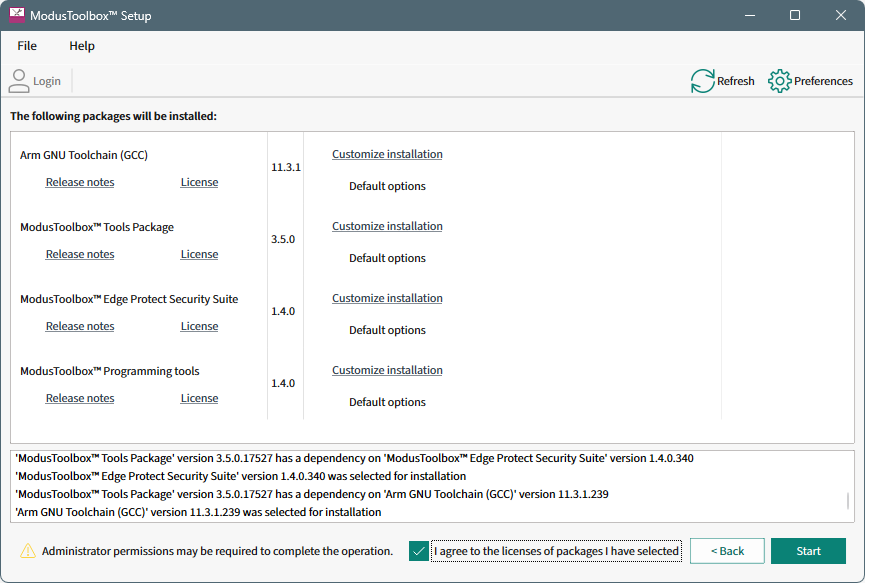 option, select the ModusToolbox™ Tools package version you want to install. This will also select the dependencies: GCC, Edge Protect Security Suite, and Programming tools.