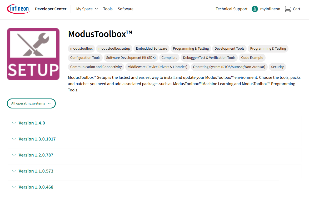 The Setup program is available from the Infineon website: https://softwaretools.infineon.com/tools/com.ifx.tb.tool.modustoolboxsetup