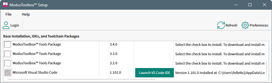 After you have installed a ModusToolbox™ tools package, the Setup program will open showing you what is installed, as well as any other packages that are available. Refer to the