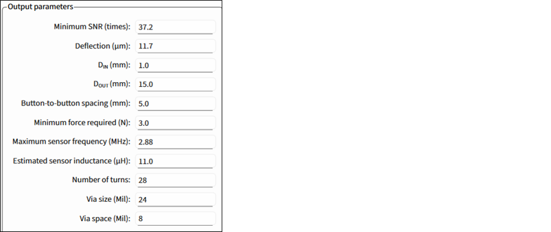 • Estimated sensor inductance (µH) – The estimated effective sensor coil inductance. The estimate is based on the number of coil turns, trace width, PCB layers, PCB layers spacing.