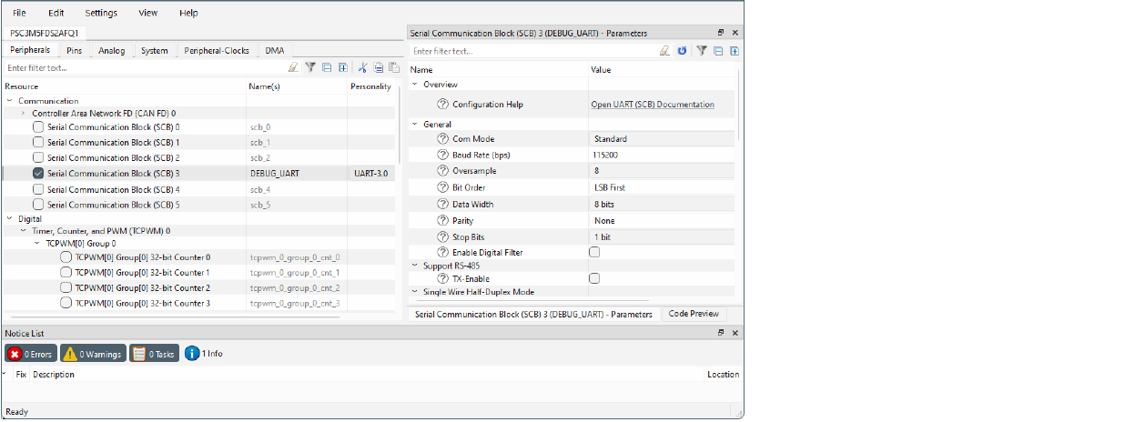 Depending on your application, you may want to update and generate some of the configuration code. While it is possible to write configuration code from scratch, the effort to do so is considerable. ModusToolbox™ software provides applications called configurators that make it easier to configure a hardware block or a middleware library. For example, instead of having to search through all the documentation to configure a serial communication block as a UART with a desired configuration, open the appropriate configurator to set the baud rate, parity, stop bits, etc.
