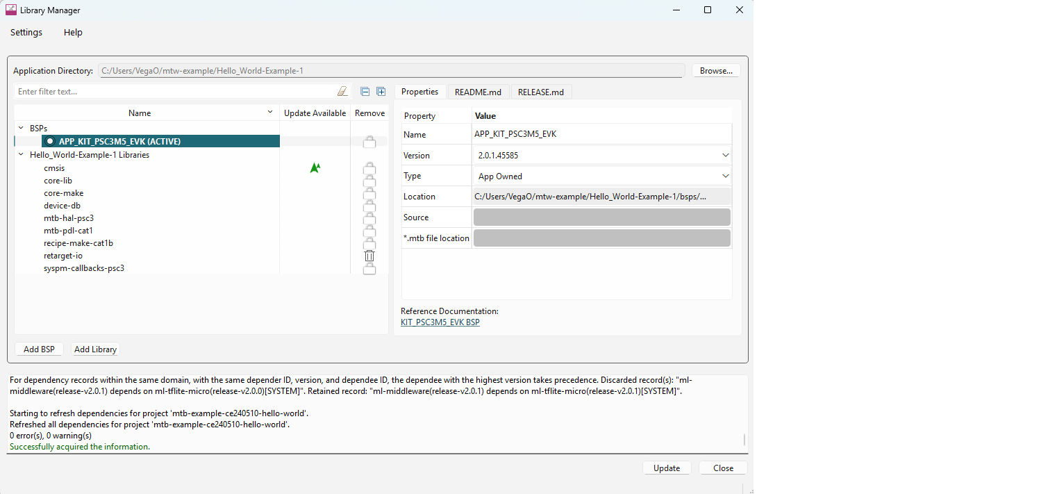 Use the Library Manager tool to add or remove BSPs and libraries for your application, as well as change versions for libraries. You can also change the active BSP for your application.