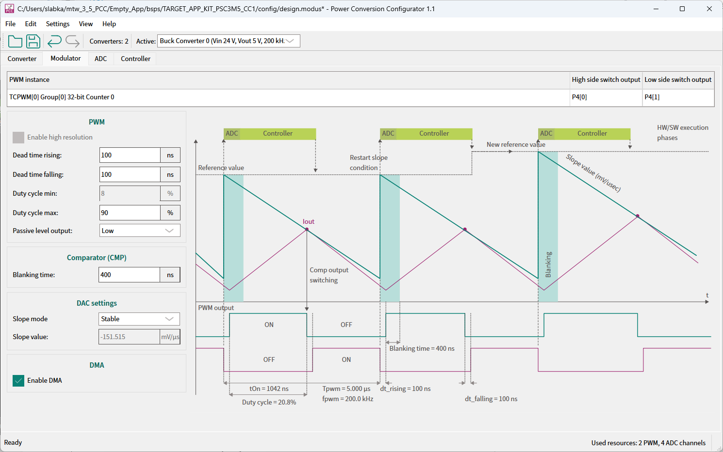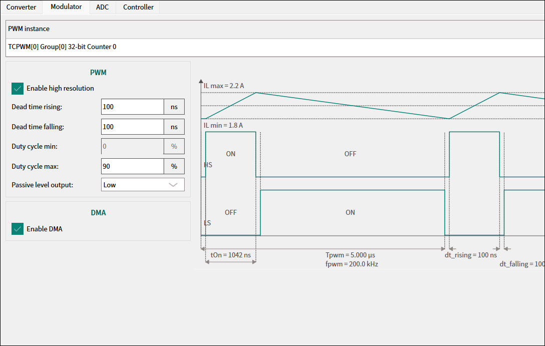 The diagram on the right side illustrates the control loop operation replotted for VCM and PCCM. At the bottom, the dynamically-replotted PWM ON/OFF scheme for the HS and LS (high/low side) switches depending on the time scale with marked PWM period, Duty cycle, and dead times. The time change of the inductance current is on the top of the scheme. In PCCM, the slope generator curve, ADC and Controller blocks present the control loop operation.
