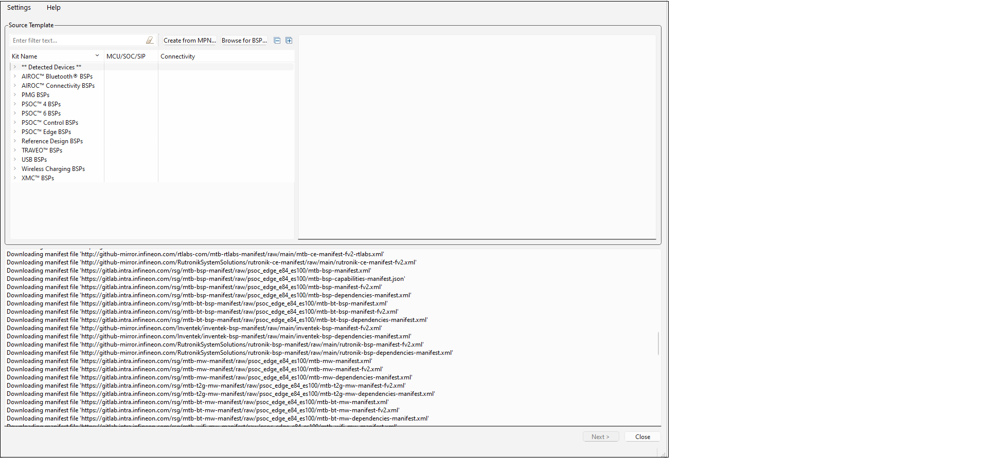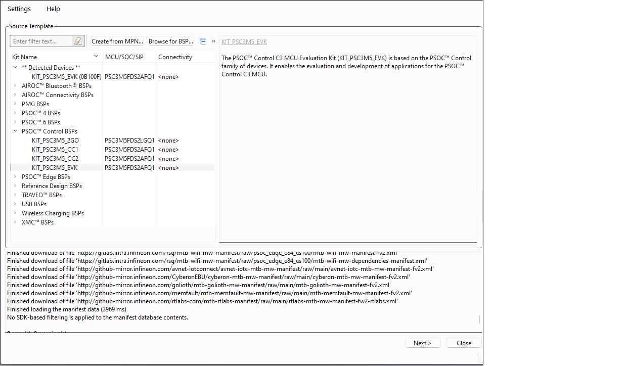 When the Project Creator tool opens, expand one of the BSP categories under Kit Name and select an appropriate kit; see the description for it on the right. For this example, select the PSC3M5_EVK kit. The following image is an example; the precise list of boards available in this version will reflect the platforms available for development.