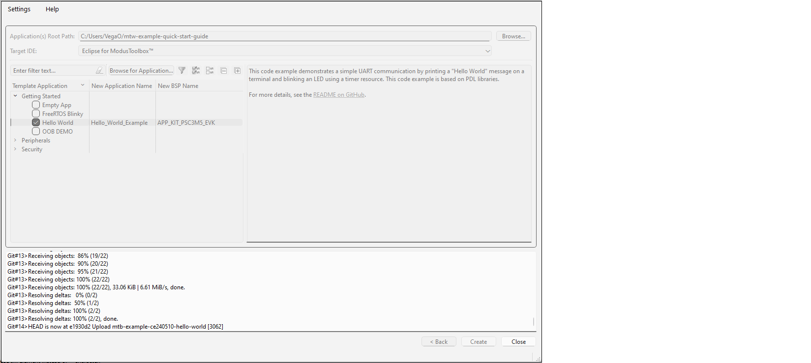to start the process of creating a ModusToolbox™ application, and the GUI will display various messages showing the progress.