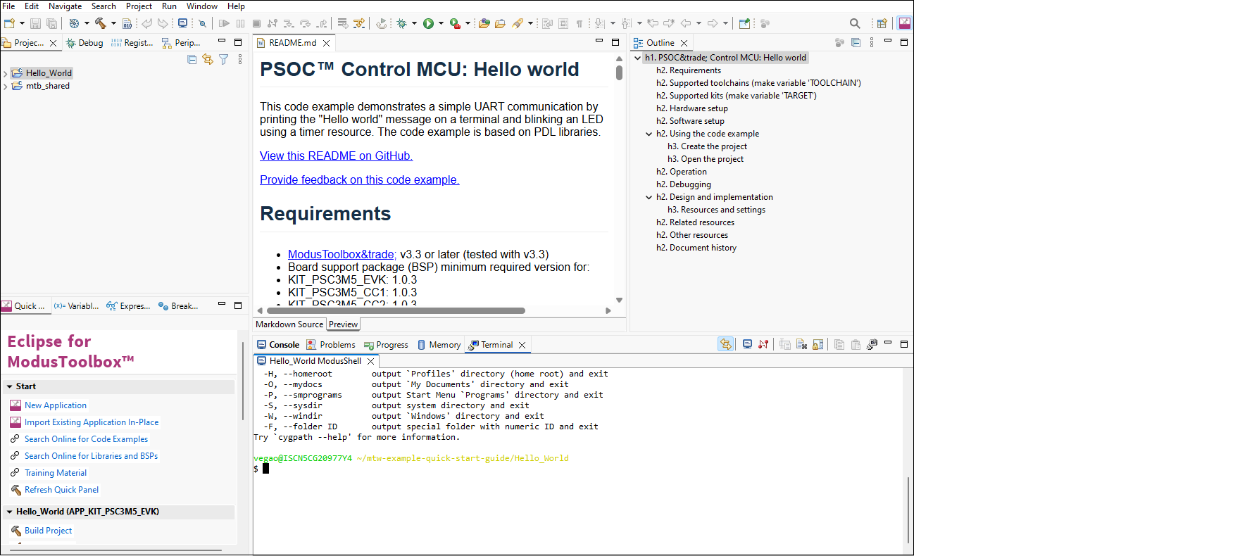 and the application will open in Eclipse. After several moments, the application opens with the Hello_World in the Project Explorer, and the