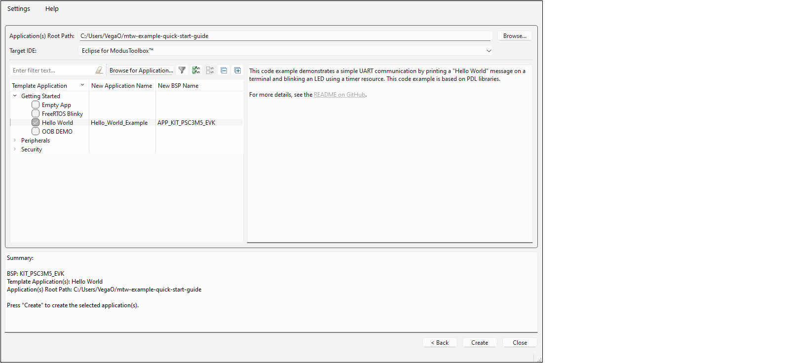 No matter which IDE you intend to use, you start by creating a ModusToolbox™ application with the Project Creator tool. Creating an application includes several steps, as follows: