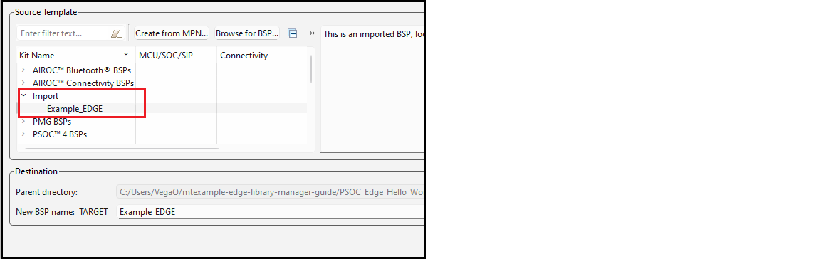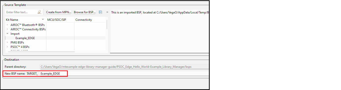 You can also rename a BSP when adding one. On the Add BSP dialog, the added BSP appears under Import. When you select the added BSP, you can type a new name for it in the New BSP name field.
