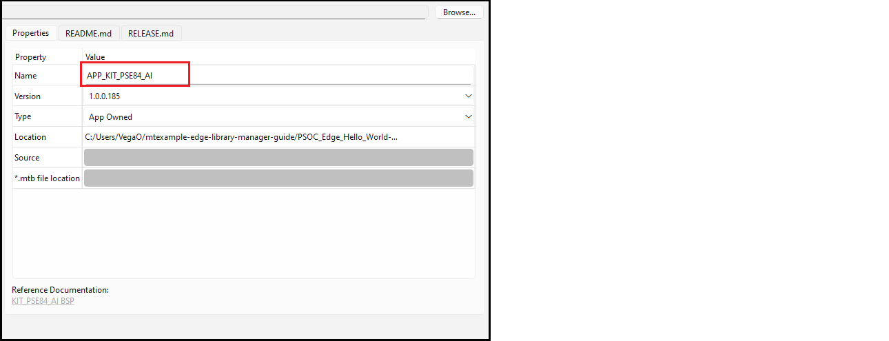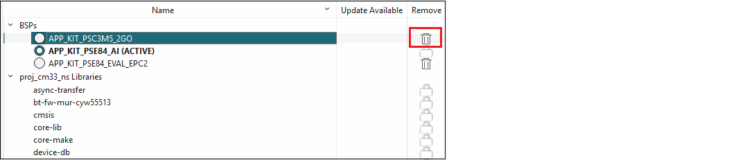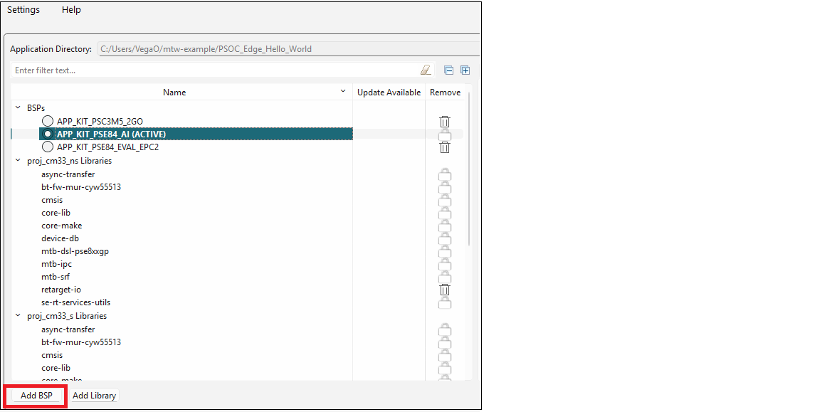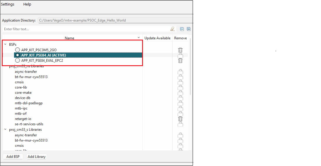 Regardless of whether you added an existing or new BSP, and whether you made other changes, the final step is to click the Update button on the main Library Manager window to commit the changes. This copies the BSP to the application and then it becomes owned by the application. This also updates the application's Makefile.