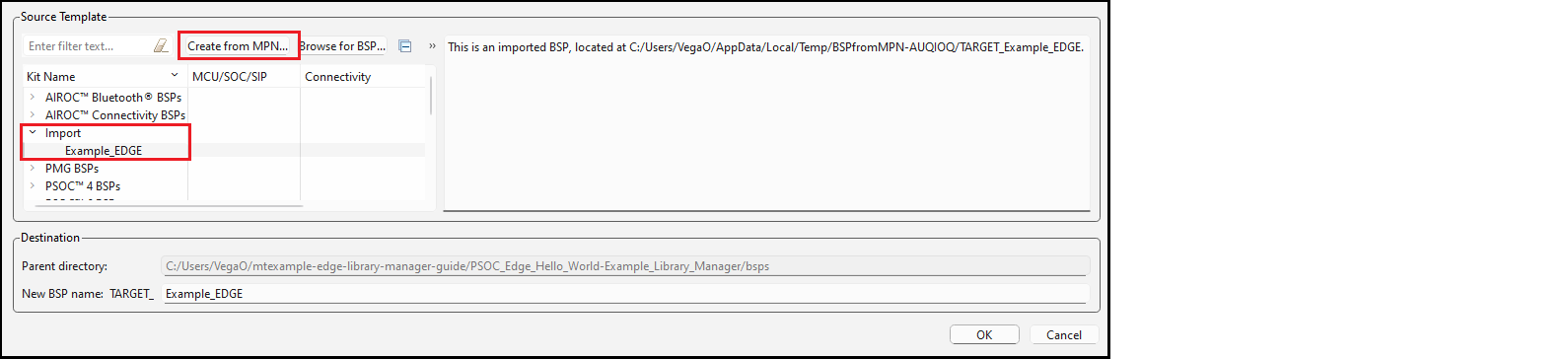 On the Add BSP dialog, click the Create from MPN button. This command opens the BSP Assistant tool to create a BSP based on device part numbers. Refer to the BSP Assistant user guide for more details about how to create a BSP from MPN. When you close the BSP Assistant, the new BSP will show up in the Add BSP dialog under Import.