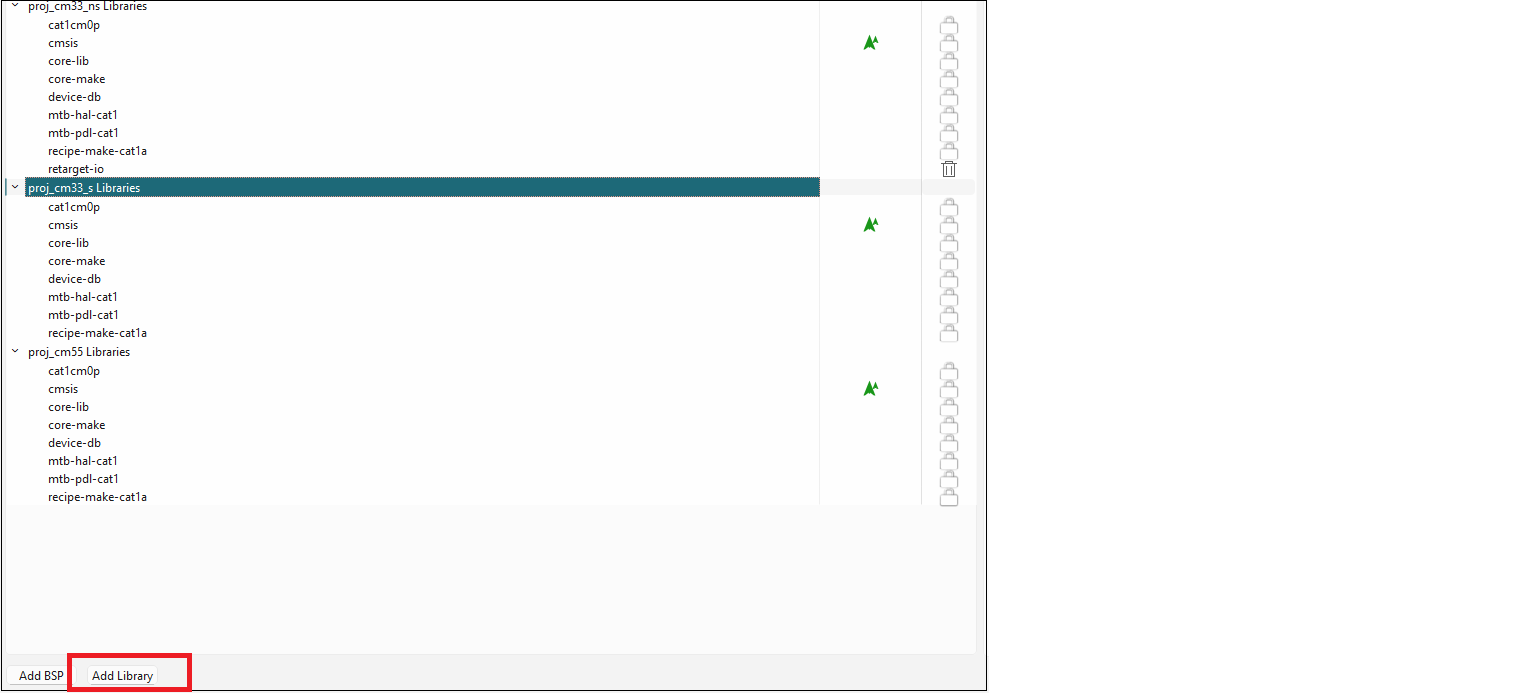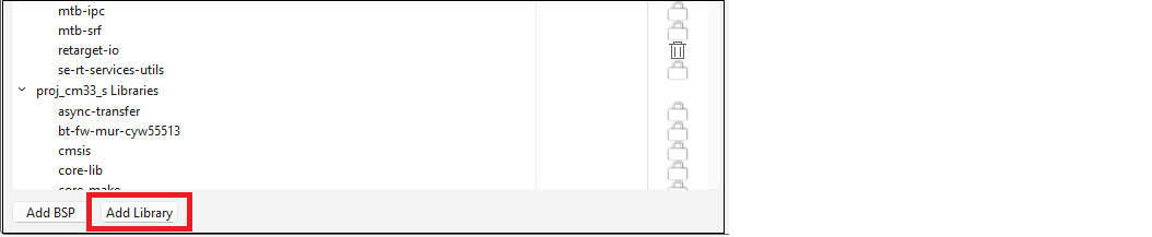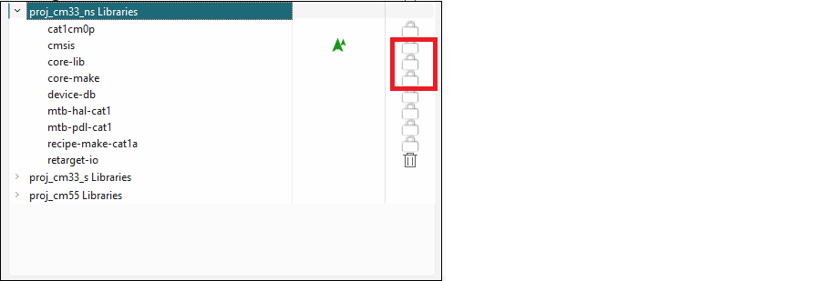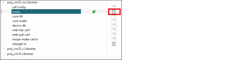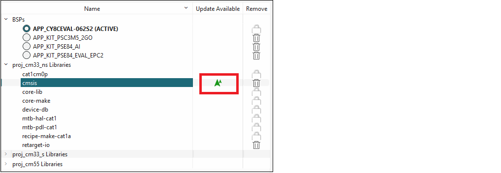 When you make a change to an Indirect Dependency library, the lock symbol changes to a Delete symbol. Unlike BSPs, this symbol indicates that after you click Update, the library is now a Direct dependency, and it is your responsibility to manage it either as a local library and/or with the selected version.