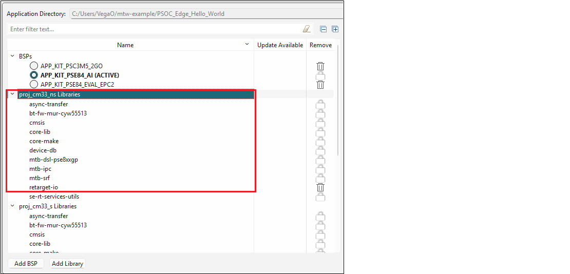 If you select Type "Local Git Repo" under the Properties tab, a new library will be created in the li**bs subdirectory, and it will not be removed from the mtb_shared library. This is because the system assumes a shared library is being used by another application. However, if you select "Shared Git repo" for a library already included as local in the application and click Update, that library will be removed from the libs subdirectory and will instead be populated in the mtb_shared directory.