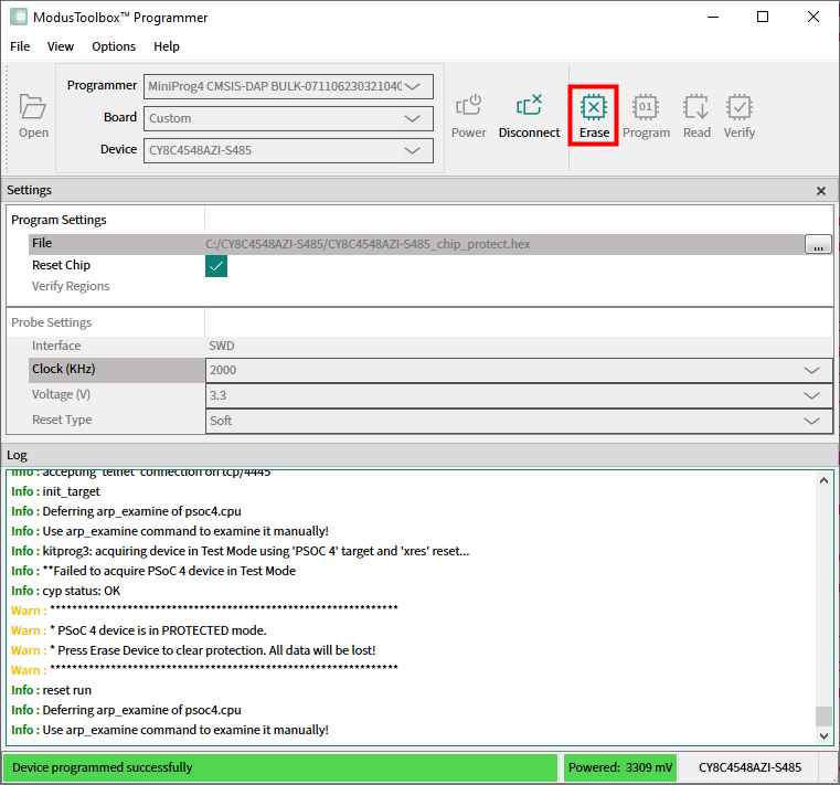 If you try to connect ModusToolbox™ Programmer to a chip-protected PSOC™ 4/CCGx device, a warning message indicates that the device is in protected mode. The only available operation is Erase device in this case.