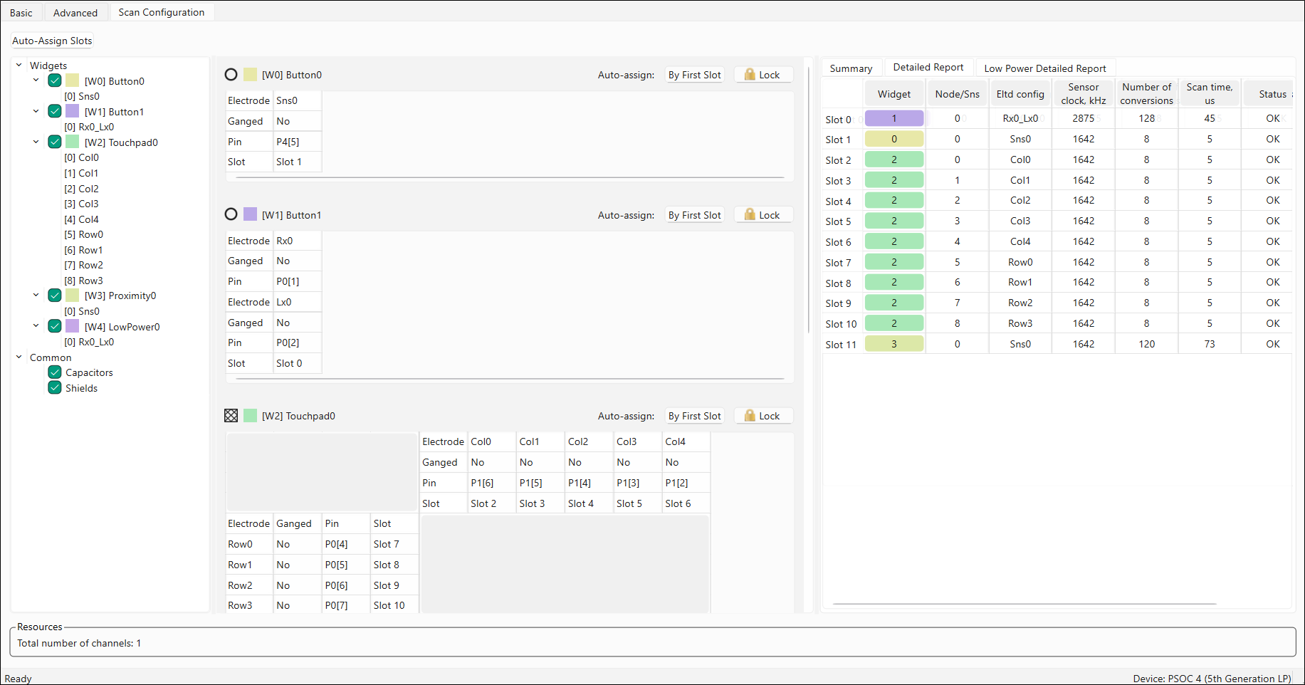 tab to distribute the electrodes among the channels, make ganged connection, assign pins and scan slots to each sensor.