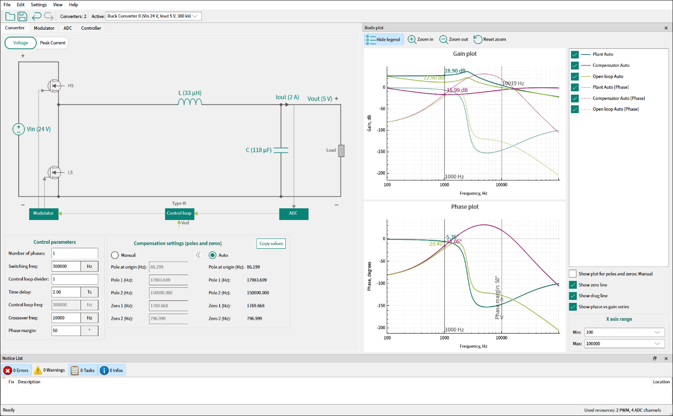 The Power Conversion Configurator provides the capabilities to initially configure a buck topology. Various parameters such as input voltage, output voltage, output current, passive components, protection, and control parameters are easily configured in the user-friendly interface. Subsequently, the Configurator generates a basic schematic diagram, a Bode plot for user reference, and calculates the controller coefficient values to facilitate the execution of a control loop in firmware implementation.