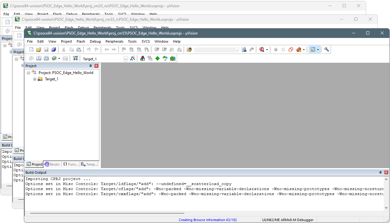 . When complete, you should have three project instances of Keil µVision open like the following image. Then, follow the instructions in this section to configure, build, program, and debug the application.