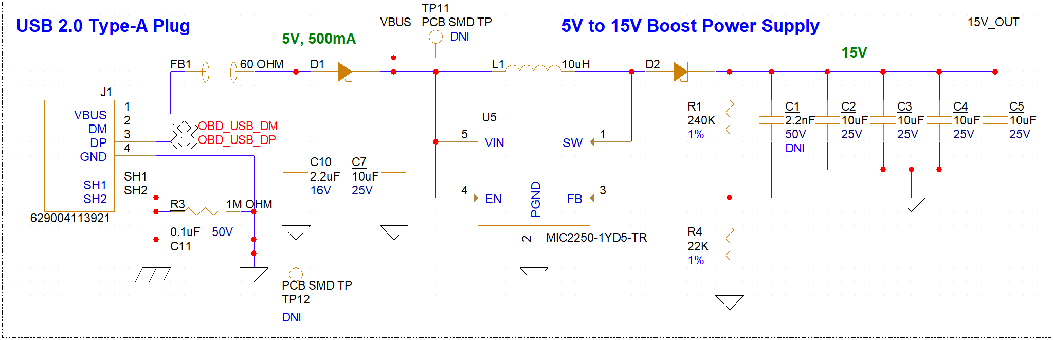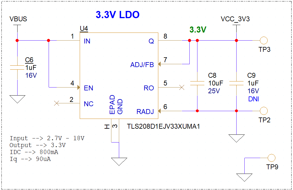 The linear regulator TLS208D1EJV33XUMA1 from Infineon is designed to generate a fixed 3.3 V output from VBUS. This LDO has internal protection for overcurrent (>800 mA), short circuit protection, and an overtemperature protection feature.