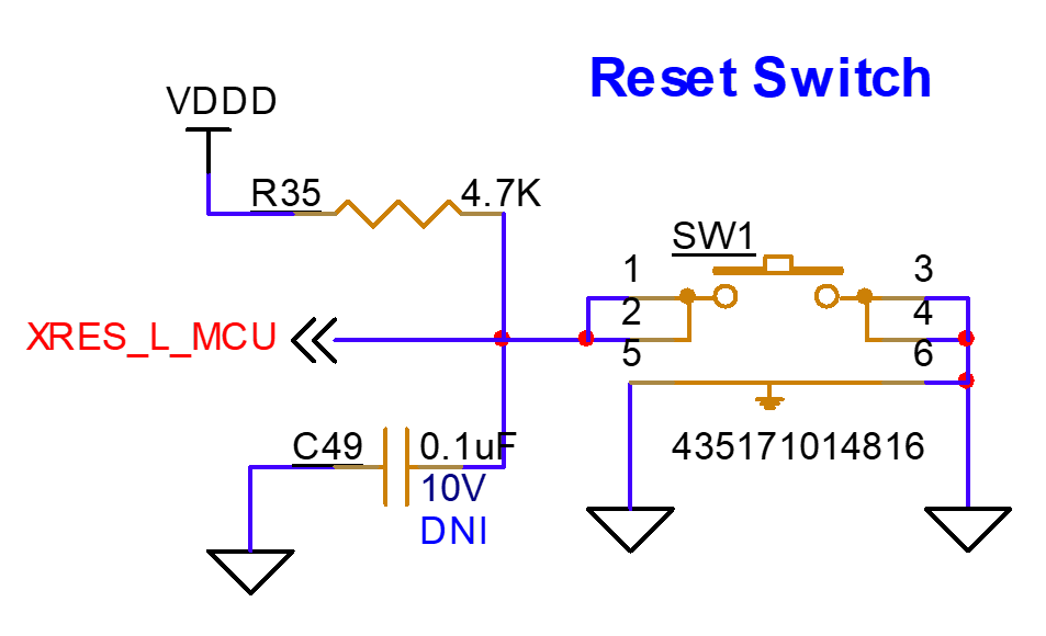 The user button (SW2) is provided for user application purpose. P4.6 from the PSOC™ C3 device is connected to SW2. Default program loaded on the kit shall use SW2 for direction control of the motor while operating in standalone mode. Upon pressing SW2 motor changes its direction from clockwise to counter clock wise direction and vise versa. A LED indication is provided for per-programmed application which denotes direction of the motor based on SW2 control.
