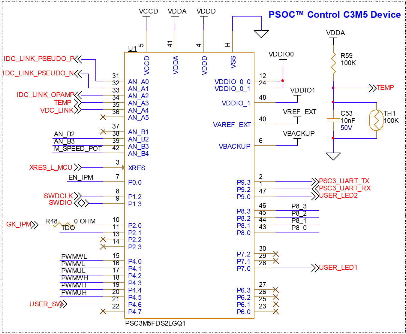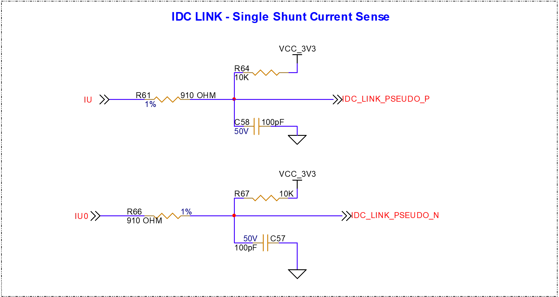 Apart from the external op-amp, provision is given on the board for the pseudo differential mode of operation, which will isolate the op-amp circuitry. The shunt measurement is directly given to the two different ports of the PSOC™ control C3 device. Two ADC signals must be processed further for internal gain control and current sensing applications for motor control operation.