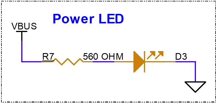 The Power LED will glow once the board is powered using USB. LED is connected to the VBUS supply of the USB input.
