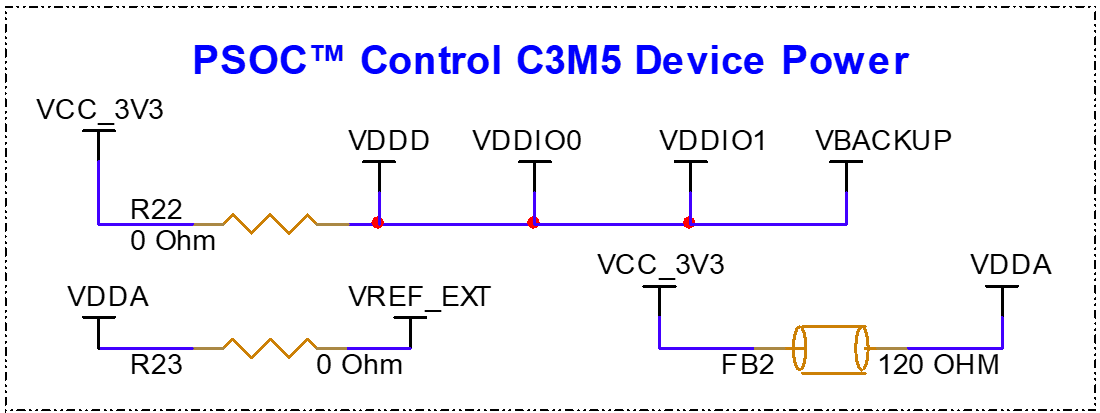 A fixed 3.3 V will be generated from a linear voltage regulator, which uses VBUS (USB-5 V) as input and generates a 3.3 V output for PSOC™ Control C3 device, XMC4200 debugger, and other peripherals.
