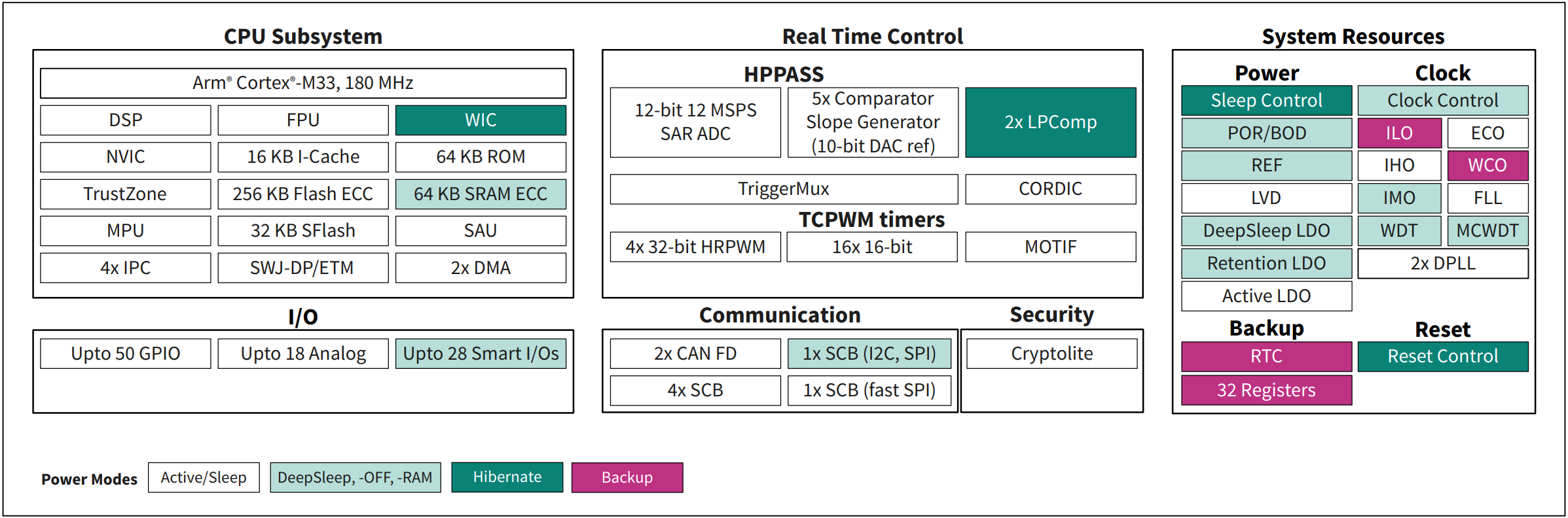 PSC3P5xD and PSC3M5xD devices are based on the Arm® Cortex®-M33, running up to 180 MHz with DSP and FPU capability. In addition to the CPU subsystem, the devices contain advanced real-time control peripherals, such as a high-performance programmable analog subsystem, comparators, advanced timers with high-resolution capability, up to six SCBs, and two CAN FDs for communication