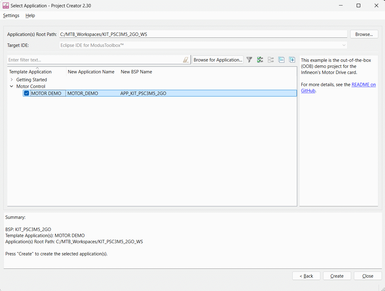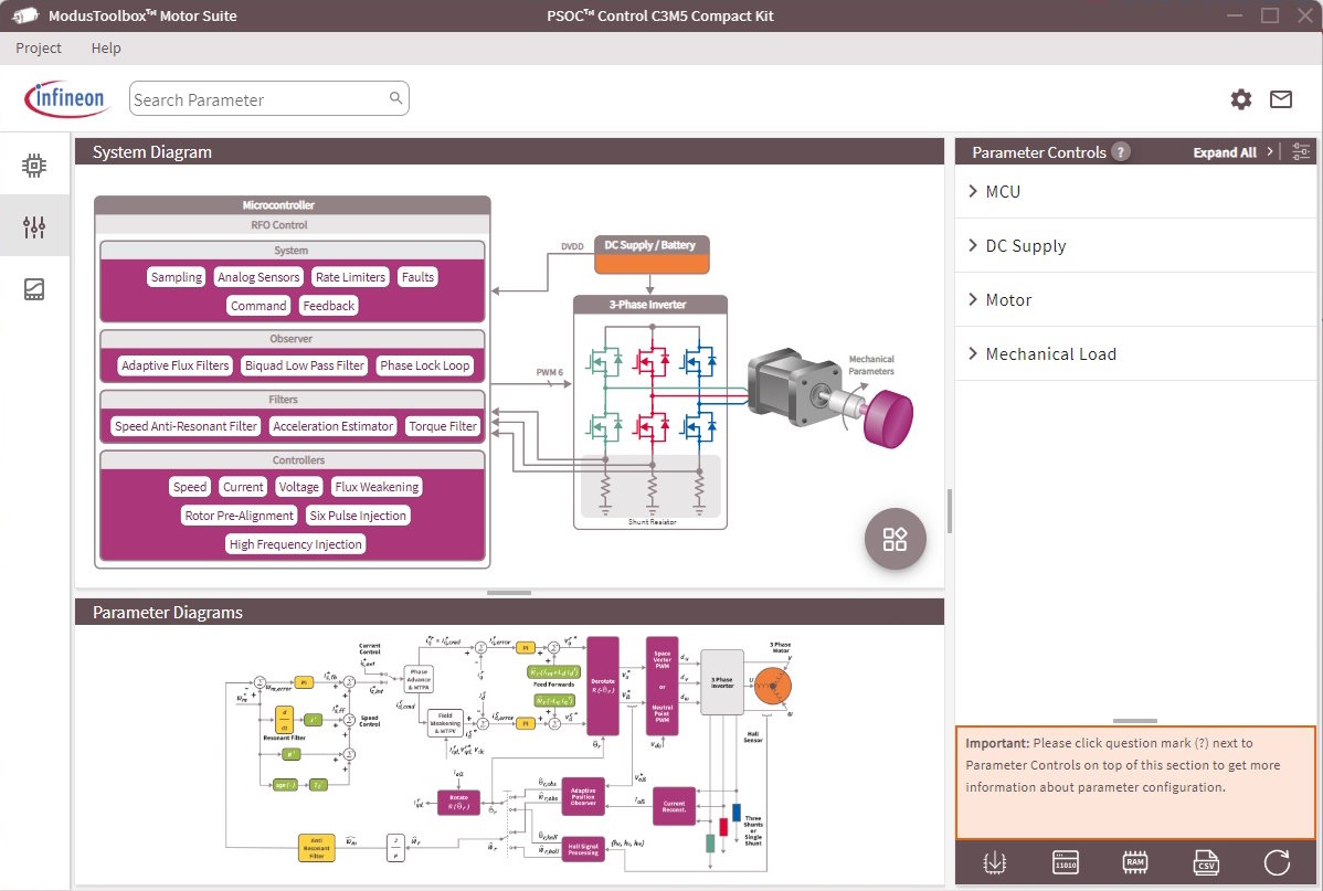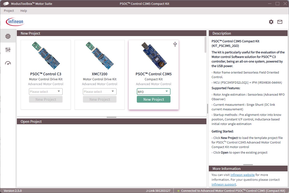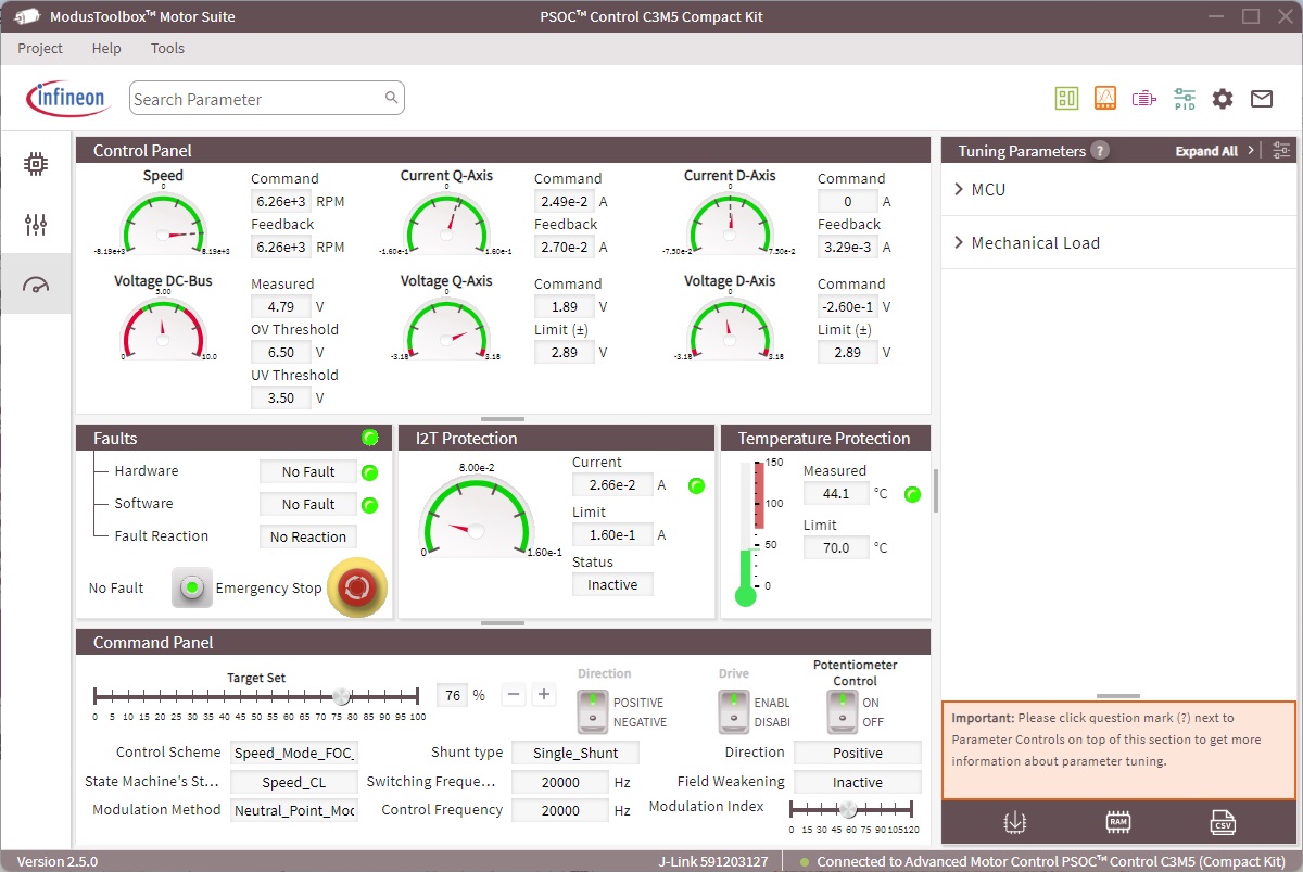 The PSOC™ Control C3M5 Compact Kit is designed as a plug-and-play device to demonstrate motor spinning applications. The kit is supported in ModusToolbox™ for comprehensive development purposes. With an intuitive graphical user interface, users can effortlessly adjust motor speed and direction in real-time, utilizing PWM control within the application. This user-friendly interface simplifies the development process, allowing designers to focus on creating innovative motor control solutions.