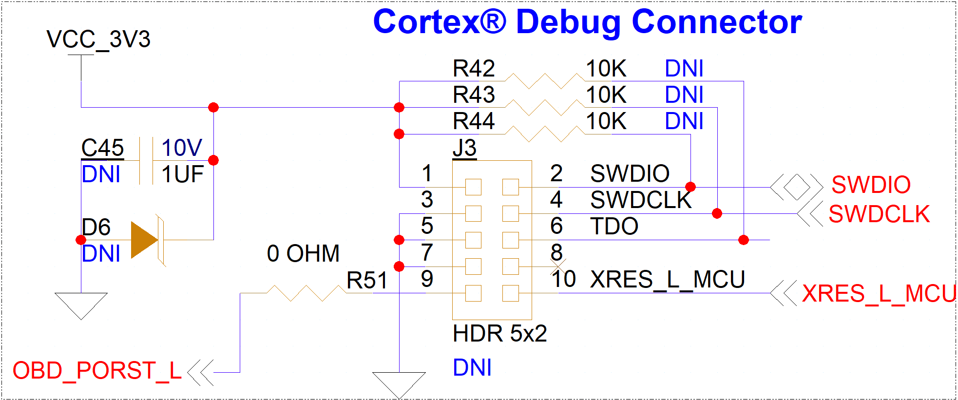 Provision for a 10-pin Cortex® standard debug connector is given on the board (only a footprint). External debuggers such as Segger J-Link can be connected to the header for debug and programming purposes. Only the SWD interface is enabled on the board. The JTAG function is not supported on the board.