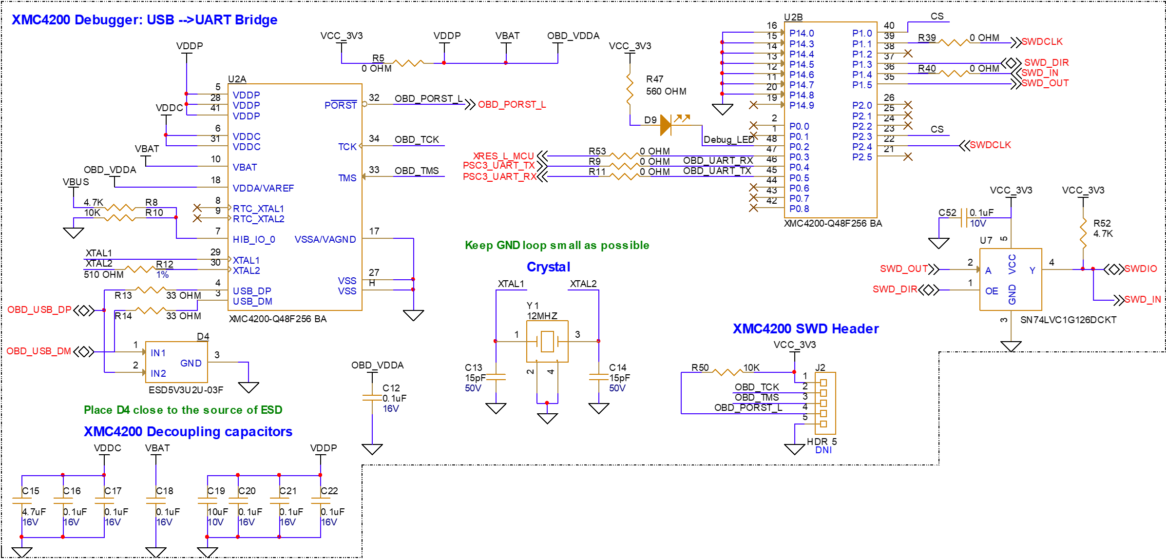 A 12 MHz crystal is used as an external clock source for the XMC4200 on-board debugger. The XTAL1 and XTAL2 pins of the XMC4200 are connected to the external crystal operation.