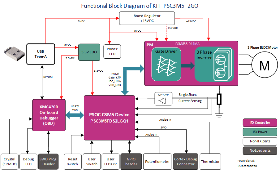 The KIT_PSC3M5_2GO PSOC™ Control C3M5 Compact Kit is designed with the PSOC™ C3M5 series MCU to run an on-the-go motor application using USB pluggable hardware and with Infineon's PSOC™ C3 family of devices. The board contains a USB interface, a DC-DC converter, a PSOC™ controller, an XMC4200 on-board debugger, an integrated power module (IPM), and a 3-phase BLDC motor with single shunt FOC support. This board is intended to be used under no-load conditions and only for the purpose of evaluating compact kit motor control software and tools. The PSOC™ Control C3M5 is a high-performance and low-power 32-bit single-core Arm® Cortex® M33-based MCU with a digital signal processor (DSP), floating-point unit (FPU), and state-of-the-art security features.