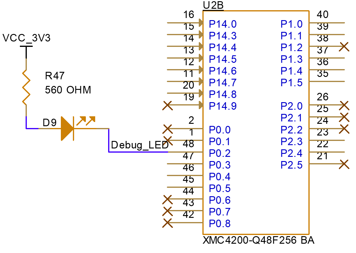 An LED connected to the XMC4200 to denote debug status: whenever the user undergoes debug mode and transmits or receives any data from the USB bridge using SWD, LED D9 will show the status by blinking based on live communication.