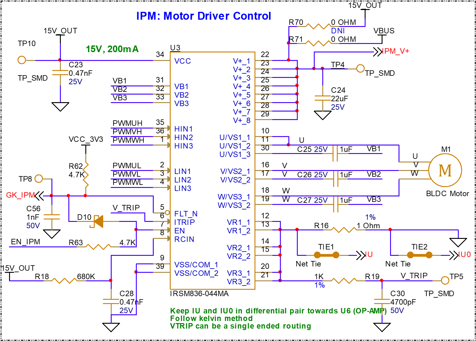 A boost regulator is used on the kit to generate 15 V output from a 5 V USB input. The IPM module inverter circuitry requires 15 V input to operate.