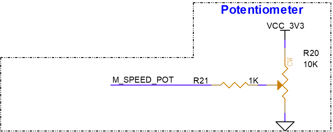 A potentiometer is used for speed control applications. The PSOC™ C3 device will be used to control the speed of the motor based on potentiometer input in standalone application. Speed control can also be controlled from the ModusToolbox™ Motor Suite application.