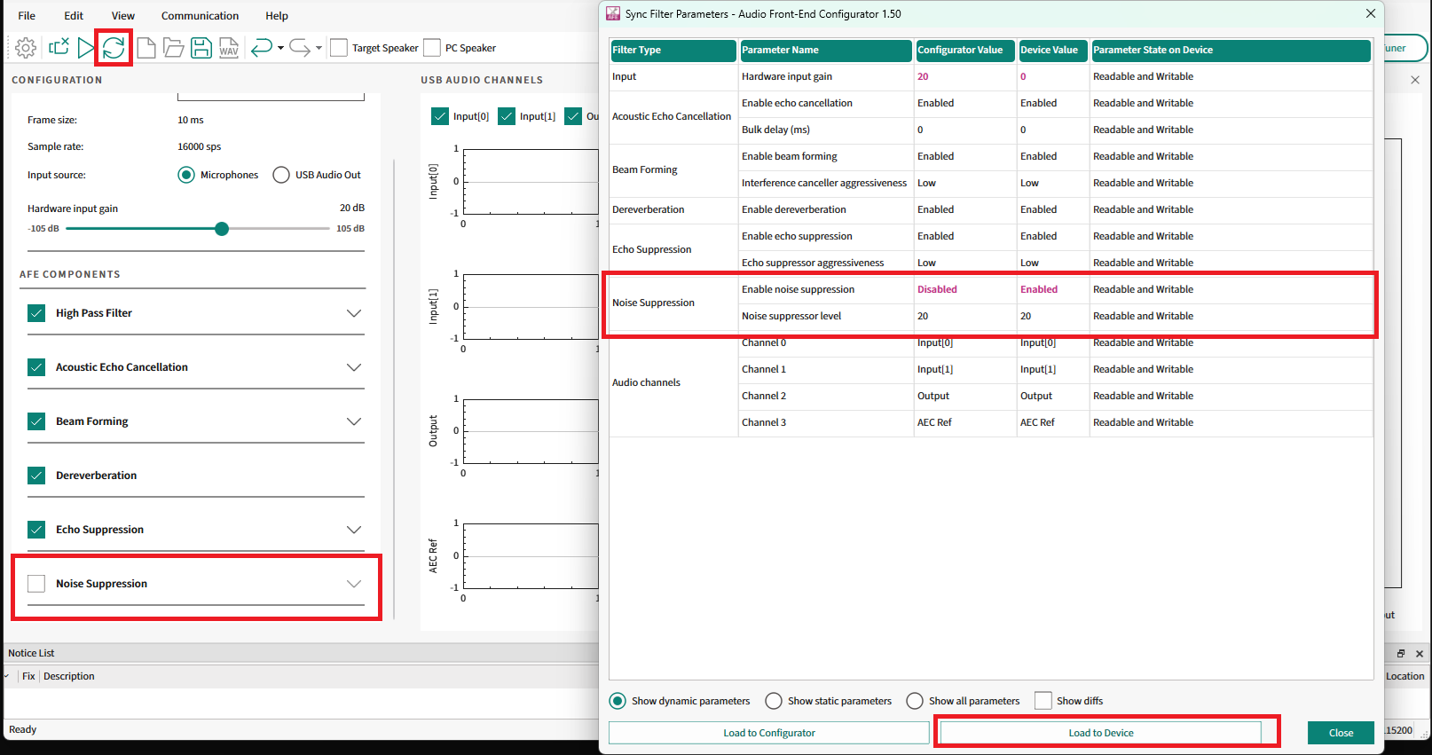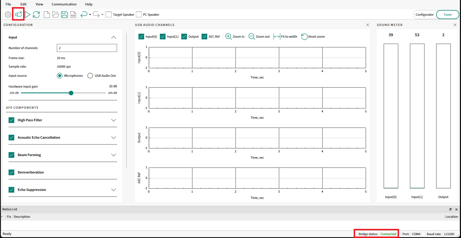 With USB enabled on the device, the AFE Configurator allows you to send and receive data between the device and the PC over USB. The streamed audio is used for PC- or device-based analysis of audio data for profiling and benchmarking. With this tool, configure the audio settings to enhance audio for different environments, such as noisy or quiet places. The configurator also provides real-time feedback on the audio to help users make informed decisions while calibrating the device.