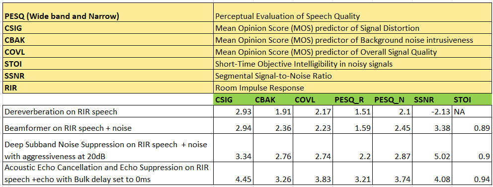 Audio Enhancement (AE) benchmarking : Details the steps for benchmarking AFE components/algorithms and provides the speech quality scores