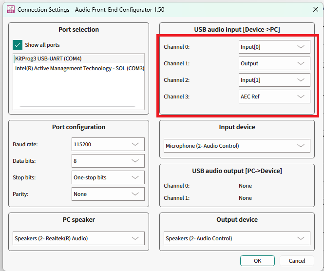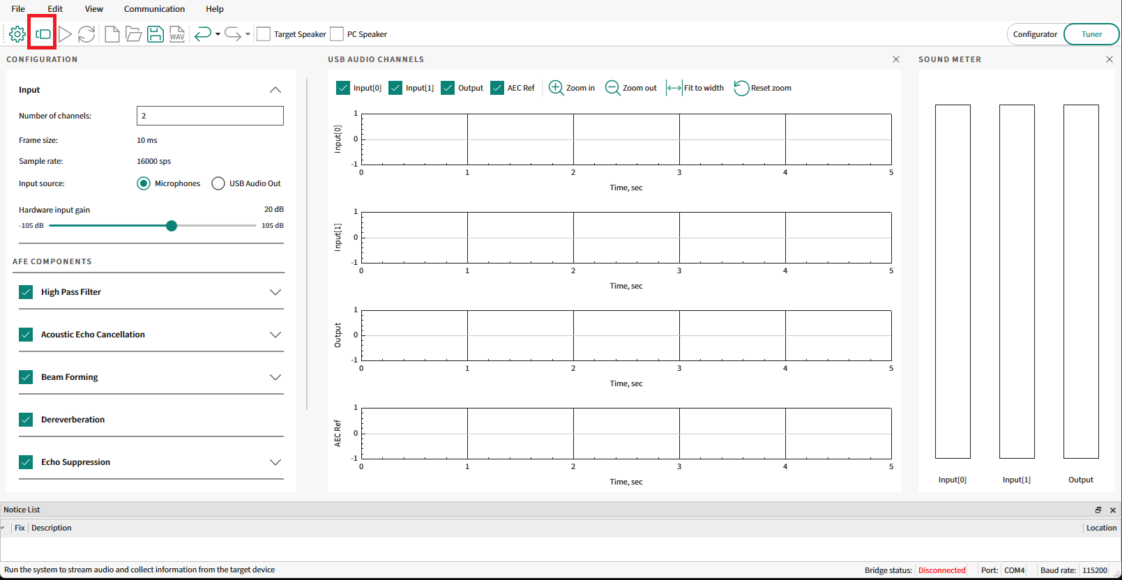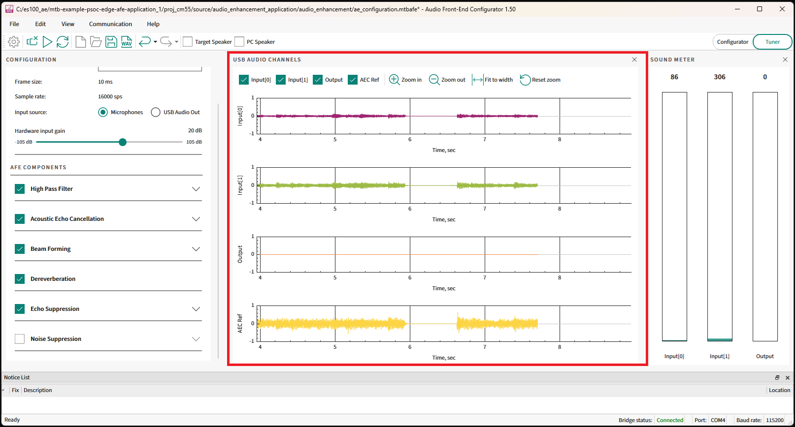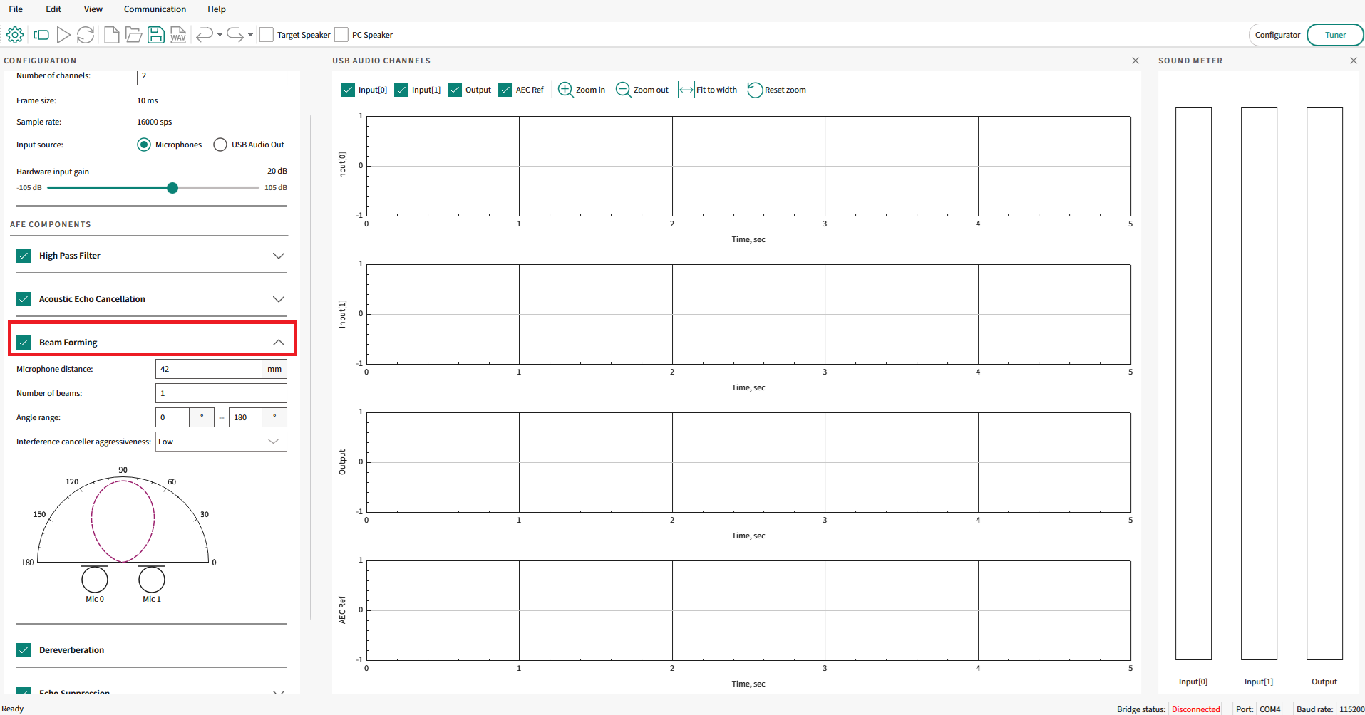 For details on all GUI components of the AFE Configurator and their usage, see the ModusToolbox™ Audio Front End Configurator user guide that is available as part of DEEPCRAFT™ Audio Enhancement Tech Pack. Once this tech pack is installed, the configurator and user guide will be available at