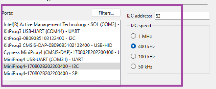 The below command should be executed once per session to configure the connection between the tool and a MiniProg4 or KitProg3 USB port.