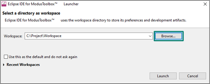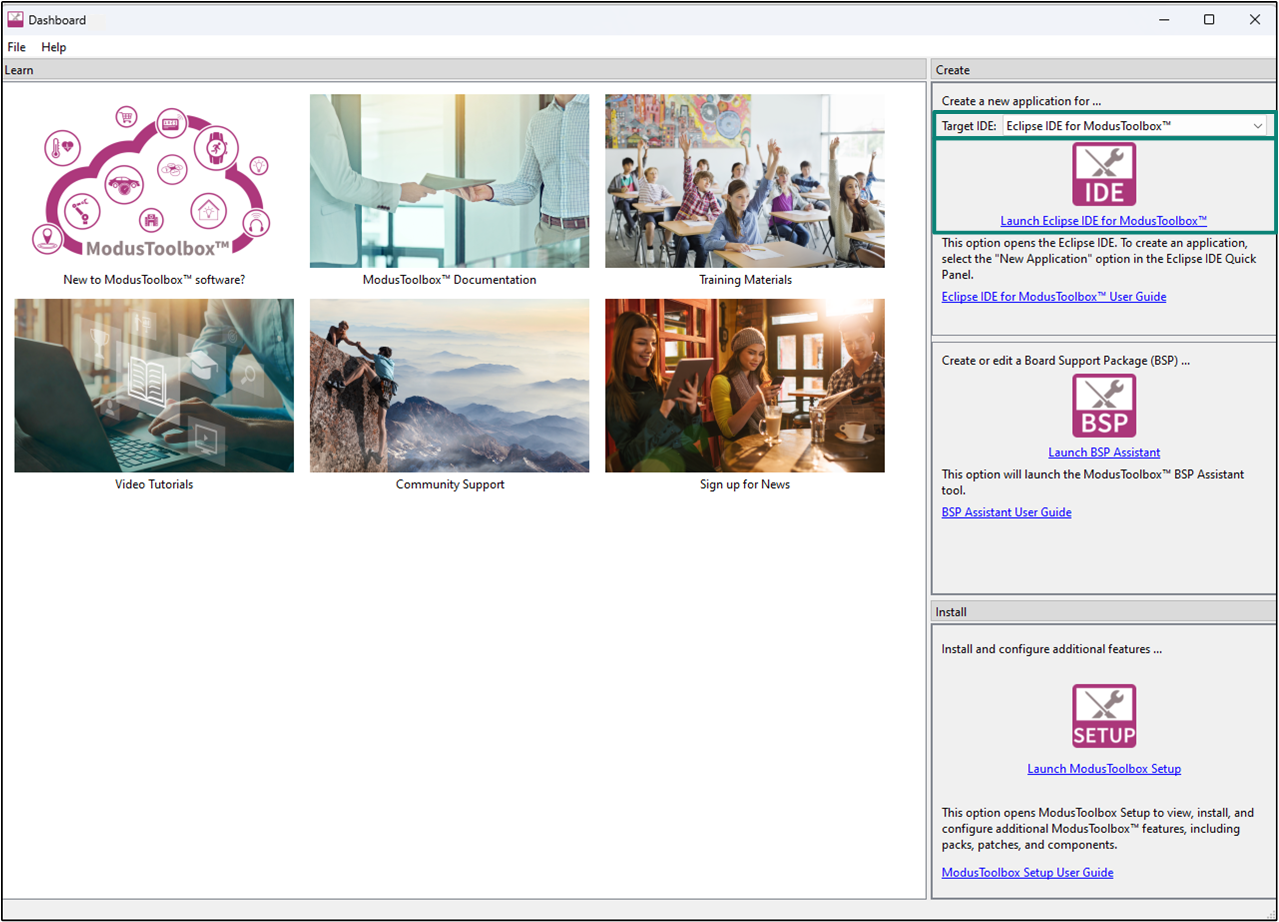 Beginning with the ModusToolbox™ tools package version 3.4.0, the Eclipse IDE for ModusToolbox™ is no longer included by default. Instead, it is a separate package that you can install via the ModusToolbox™ Setup program.