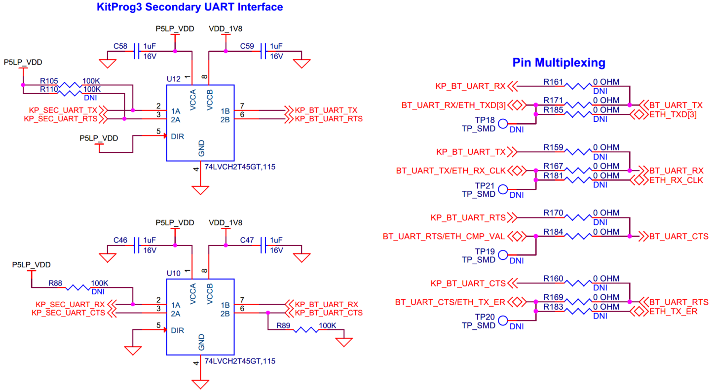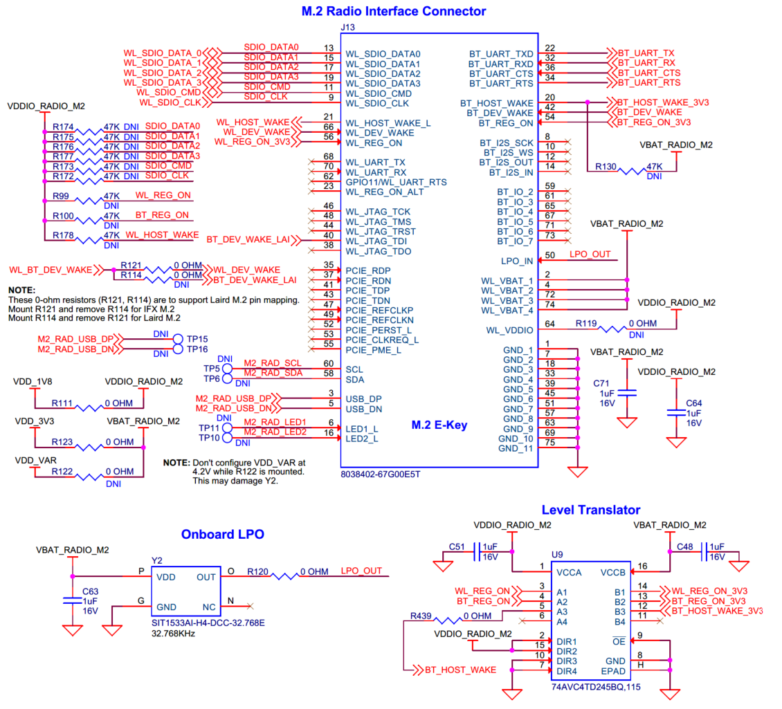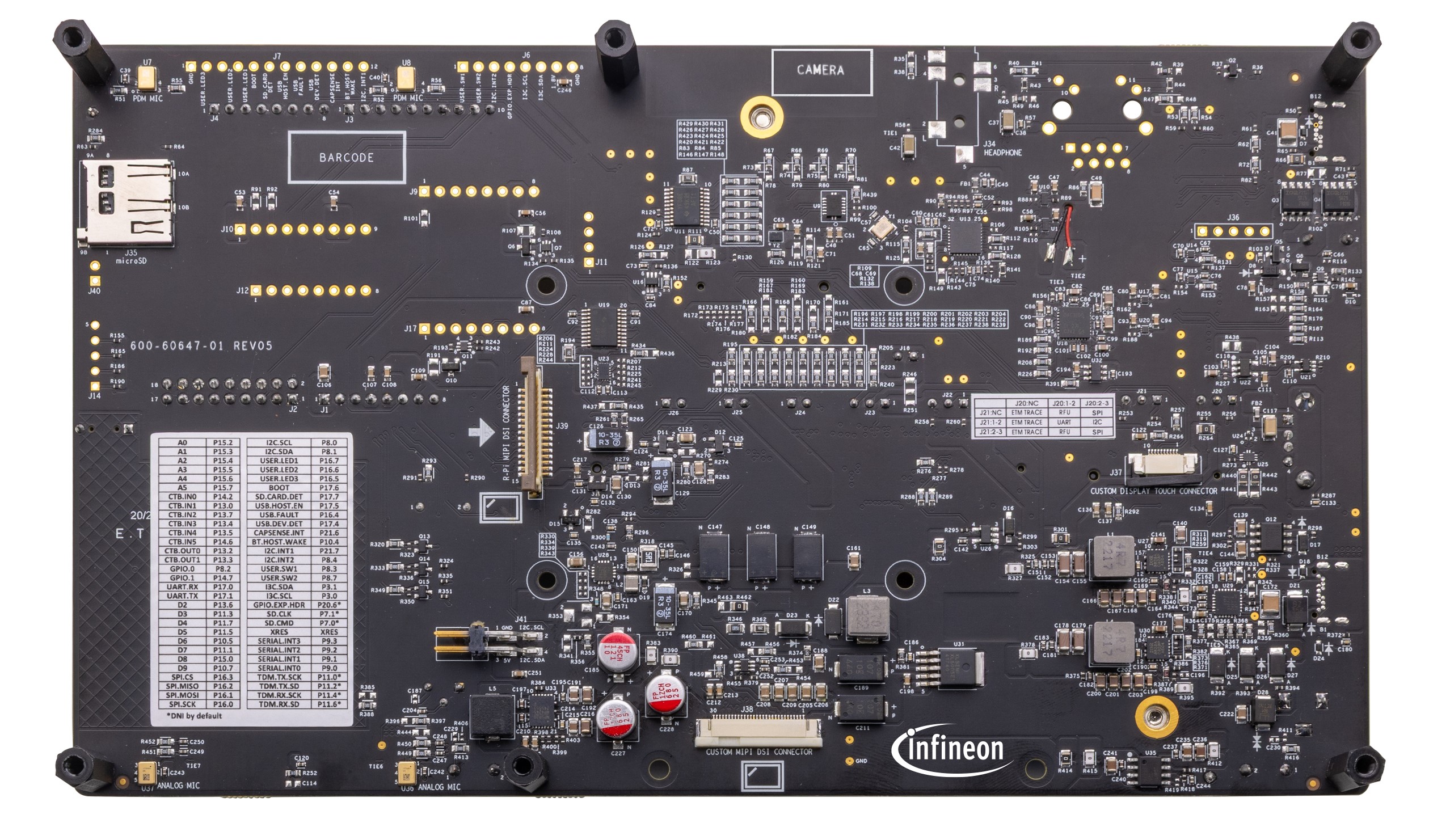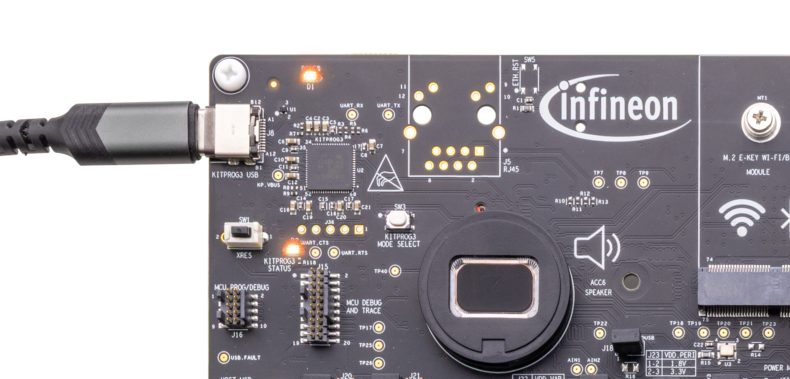 The baseboard has M.2 interface connectors for interfacing external radio modules based on AIROC™ Wi-Fi & Bluetooth® combos and external memory interfaces. The base-board features an on-board programmer/debugger (KitProg3), ETM/JTAG/SWD debug headers, a custom display capacitive touch panel connector, an R-Pi compatible MIPI-DSI connector and a MIPI-DSI custom display connector, analog and PDM microphones, a headphone connector, a speaker, USB host Type-A and USB device Type-C connectors, an RJ45 Ethernet connector, an M.2 (B-key) memory interface and an M.2 (E-key) radio interface, Infineon’s Shield2Go interface, MikroElektronika's mikroBUS compatible headers, a 6-Axis IMU sensor, a 3-axis magnetometer, a microSD card holder, CAPSENSE™ buttons and slide, user LEDs, and user buttons. The MCU power domain supports 2.7 V, 3.3 V, and 4.2 V operating voltages, and the peripheral power domain supports 1.8 V and 3.3 V operating voltages.