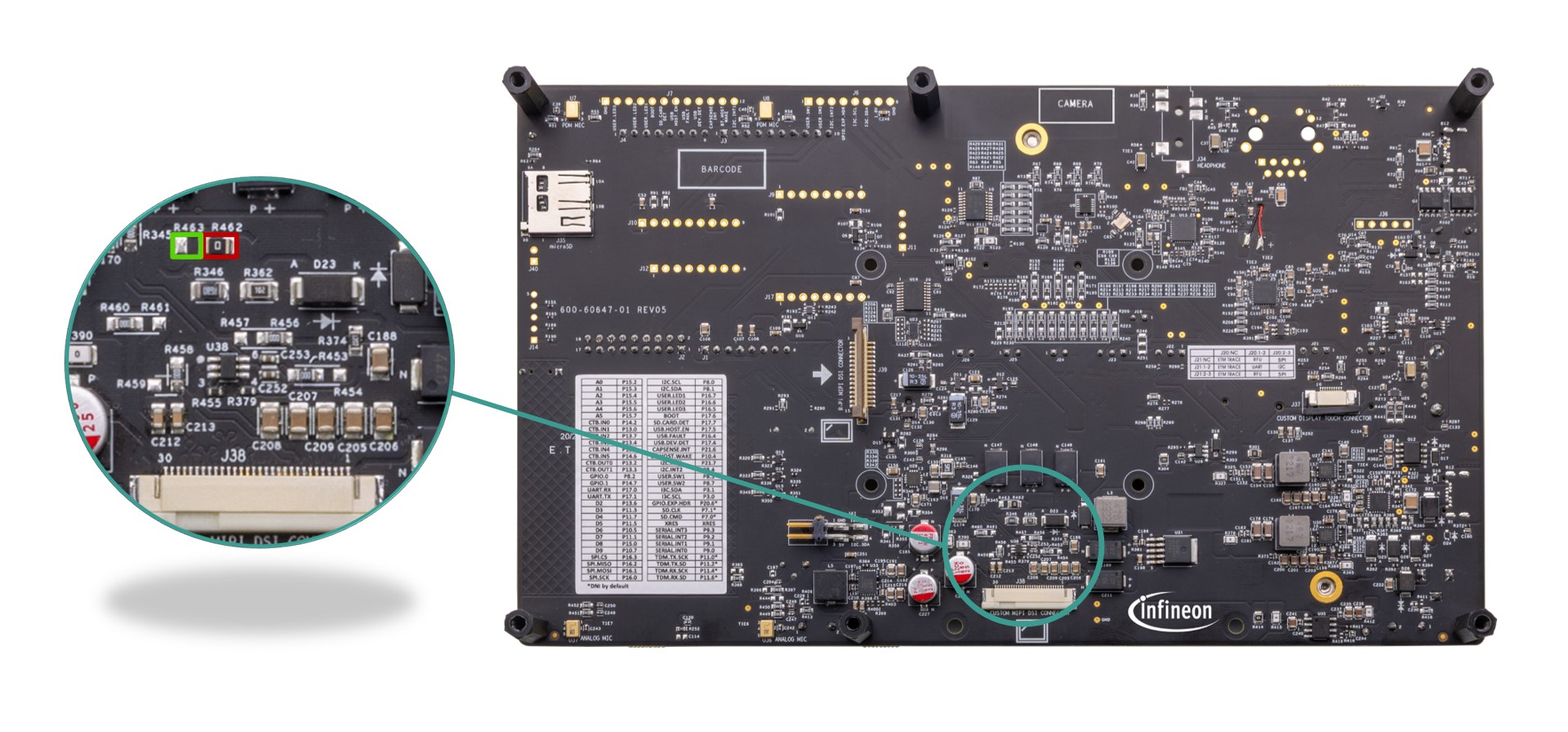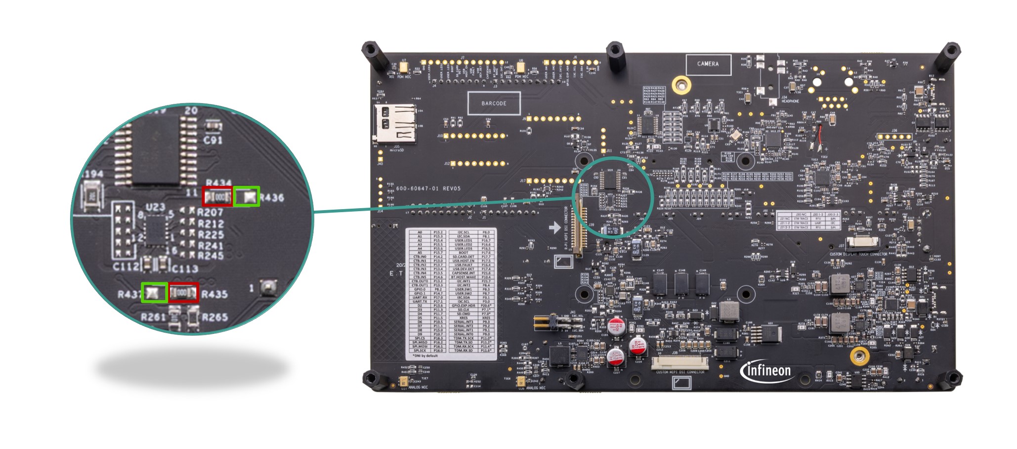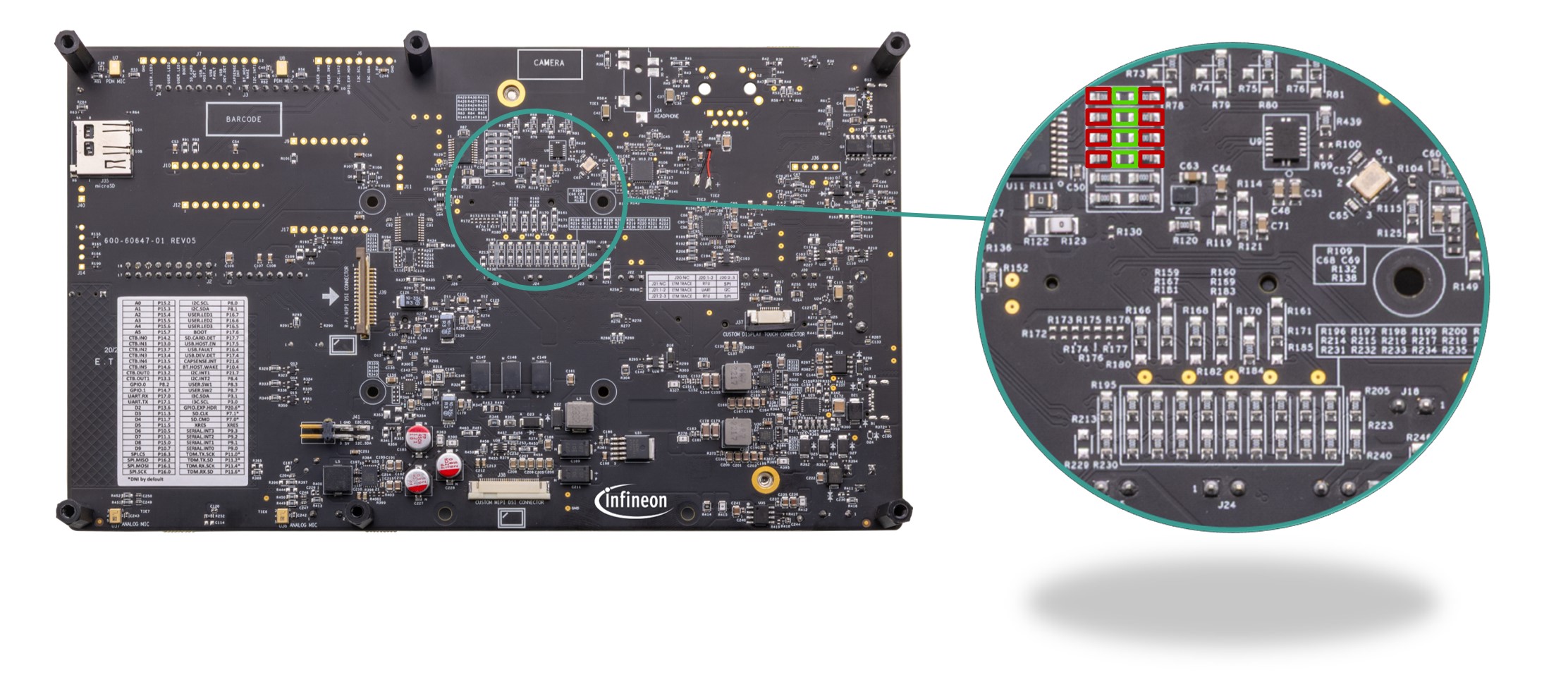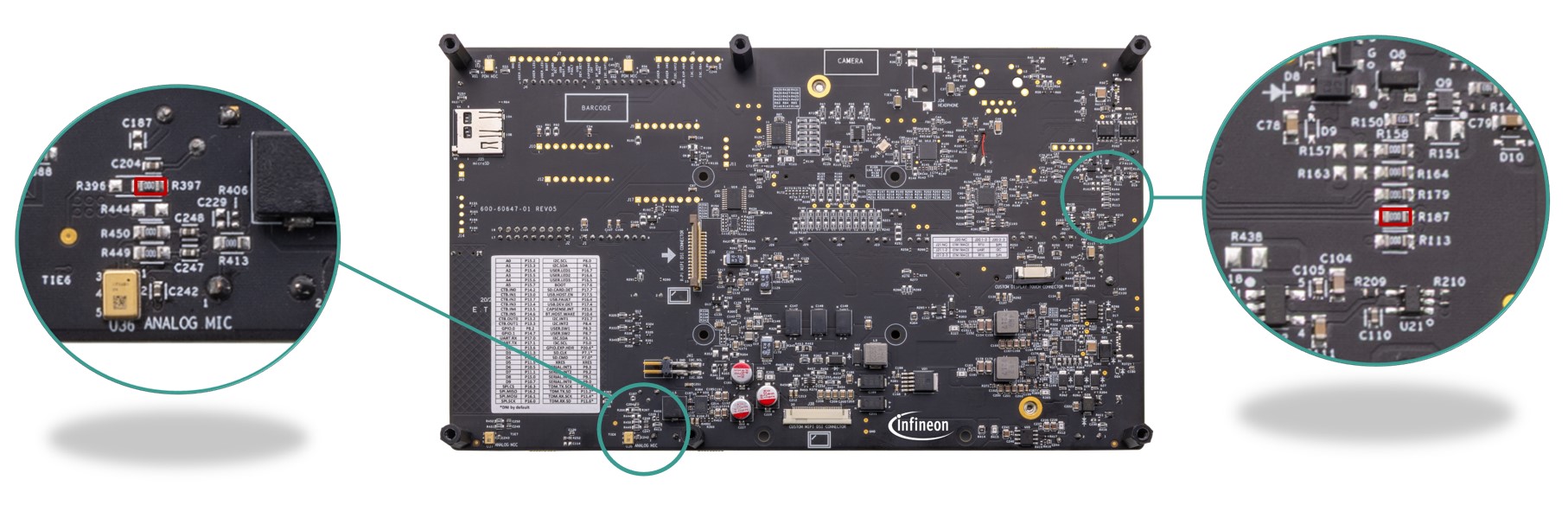 The baseboard has M.2 interface connectors for interfacing external radio modules based on AIROC™ Wi-Fi & Bluetooth® combos and external memory interfaces. The base-board features an on-board programmer/debugger (KitProg3), ETM/JTAG/SWD debug headers, a custom display capacitive touch panel connector, an R-Pi compatible MIPI-DSI connector and a MIPI-DSI custom display connector, analog and PDM microphones, a headphone connector, a speaker, USB host Type-A and USB device Type-C connectors, an RJ45 Ethernet connector, an M.2 (B-key) memory interface and an M.2 (E-key) radio interface, Infineon’s Shield2Go interface, MikroElektronika's mikroBUS compatible headers, a 6-Axis IMU sensor, a 3-axis magnetometer, a microSD card holder, CAPSENSE™ buttons and slide, user LEDs, and user buttons. The MCU power domain supports 2.7 V, 3.3 V, and 4.2 V operating voltages, and the peripheral power domain supports 1.8 V and 3.3 V operating voltages.