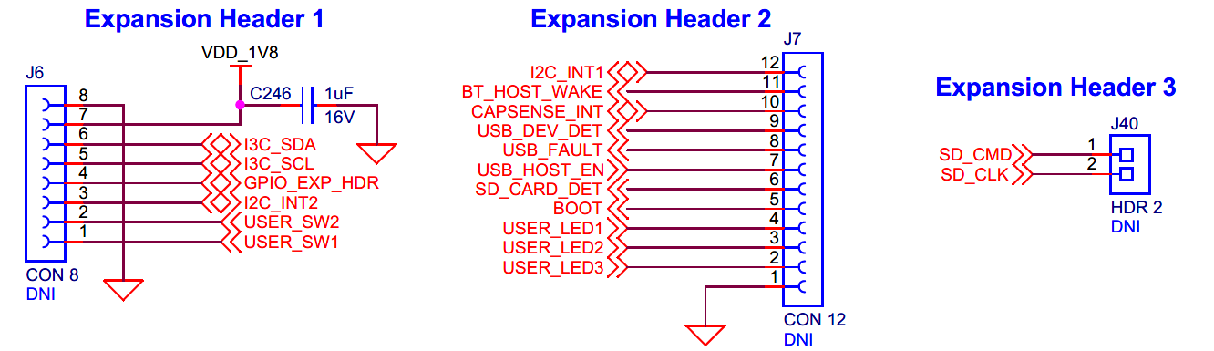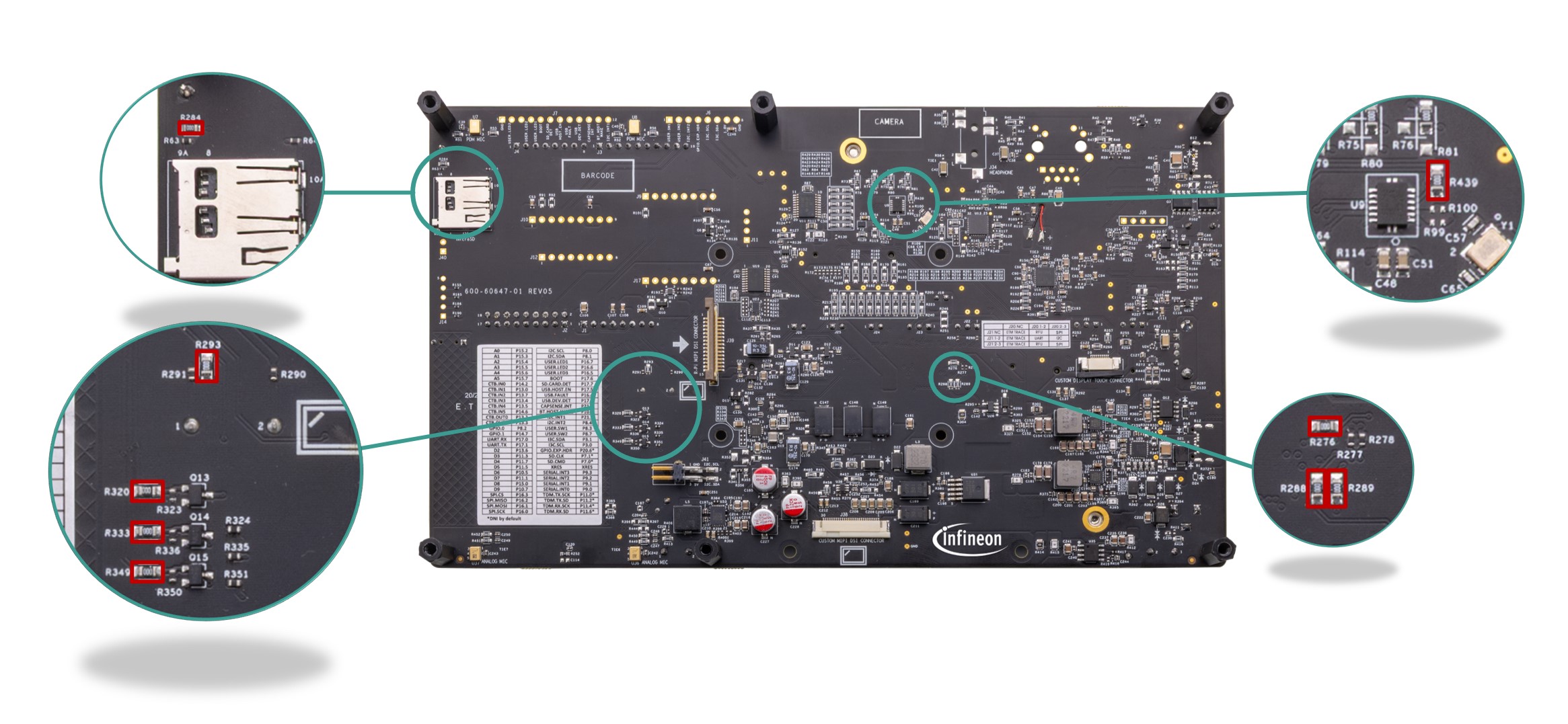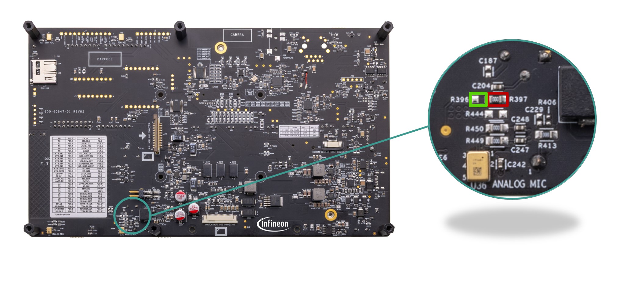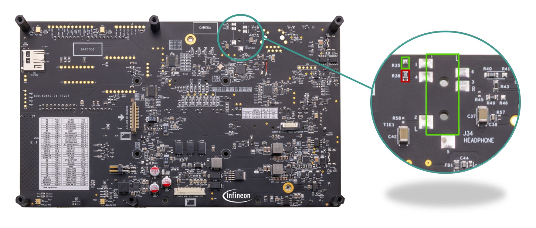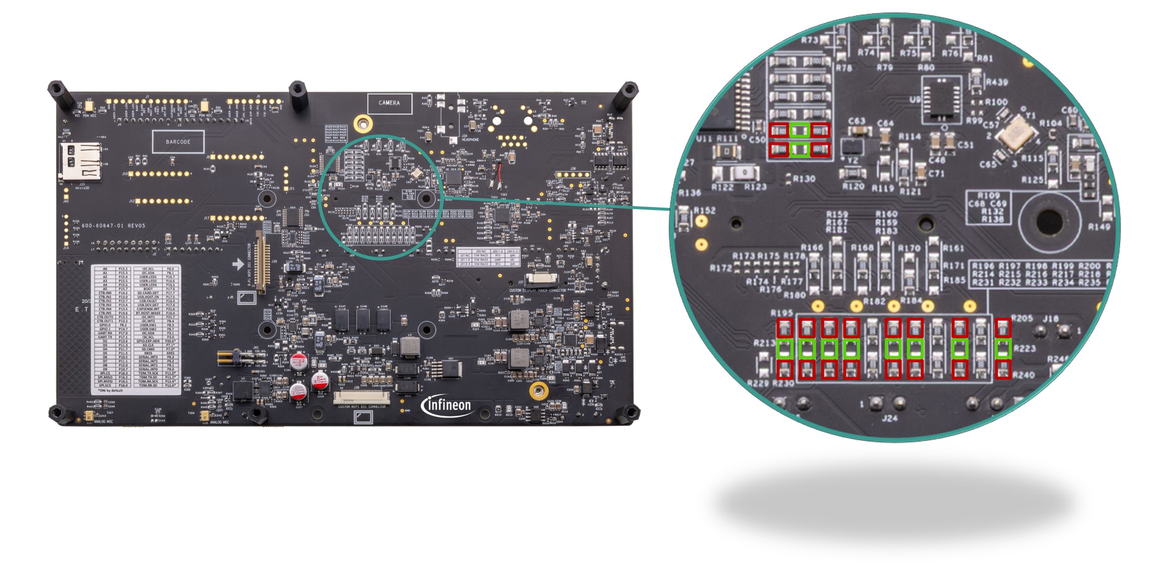 The baseboard has M.2 interface connectors for interfacing external radio modules based on AIROC™ Wi-Fi & Bluetooth® combos and external memory interfaces. The base-board features an on-board programmer/debugger (KitProg3), ETM/JTAG/SWD debug headers, a custom display capacitive touch panel connector, an R-Pi compatible MIPI-DSI connector and a MIPI-DSI custom display connector, analog and PDM microphones, a headphone connector, a speaker, USB host Type-A and USB device Type-C connectors, an RJ45 Ethernet connector, an M.2 (B-key) memory interface and an M.2 (E-key) radio interface, Infineon’s Shield2Go interface, MikroElektronika's mikroBUS compatible headers, a 6-Axis IMU sensor, a 3-axis magnetometer, a microSD card holder, CAPSENSE™ buttons and slide, user LEDs, and user buttons. The MCU power domain supports 2.7 V, 3.3 V, and 4.2 V operating voltages, and the peripheral power domain supports 1.8 V and 3.3 V operating voltages.