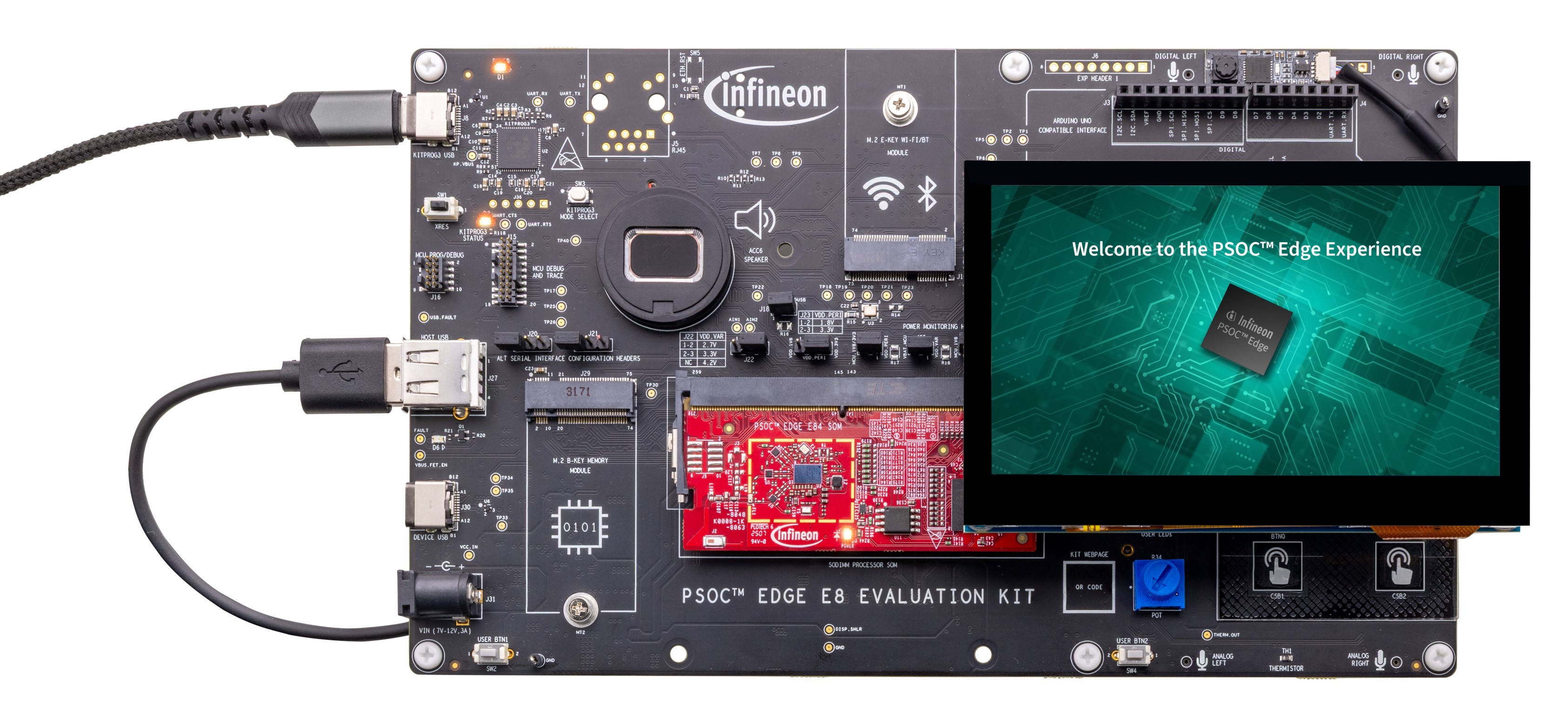 (called “PSOC™ E84”) and a multitude of on-board multimedia, Machine Learning (ML), and connectivity features like MIPI-DSI displays, audio interfaces, and AIROC™ Wi-Fi & Bluetooth® combo-based connectivity modules.