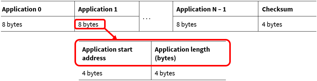 The application metadata has eight bytes of data per application, followed by four bytes for checksum, as shown in