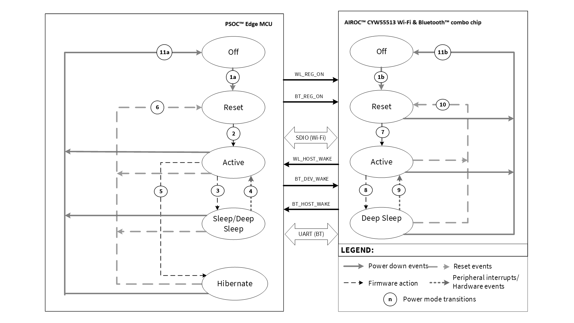10 | AIROC™ CYW55513 Wi-Fi & Bluetooth® combo chip transitions to reset state | External events transition AIROC™ CYW55513 Wi-Fi & Bluetooth® combo chip to reset state; both WL_REG_ON and BT_REG_ON are pulled LOW by PSOC™ Edge MCU |