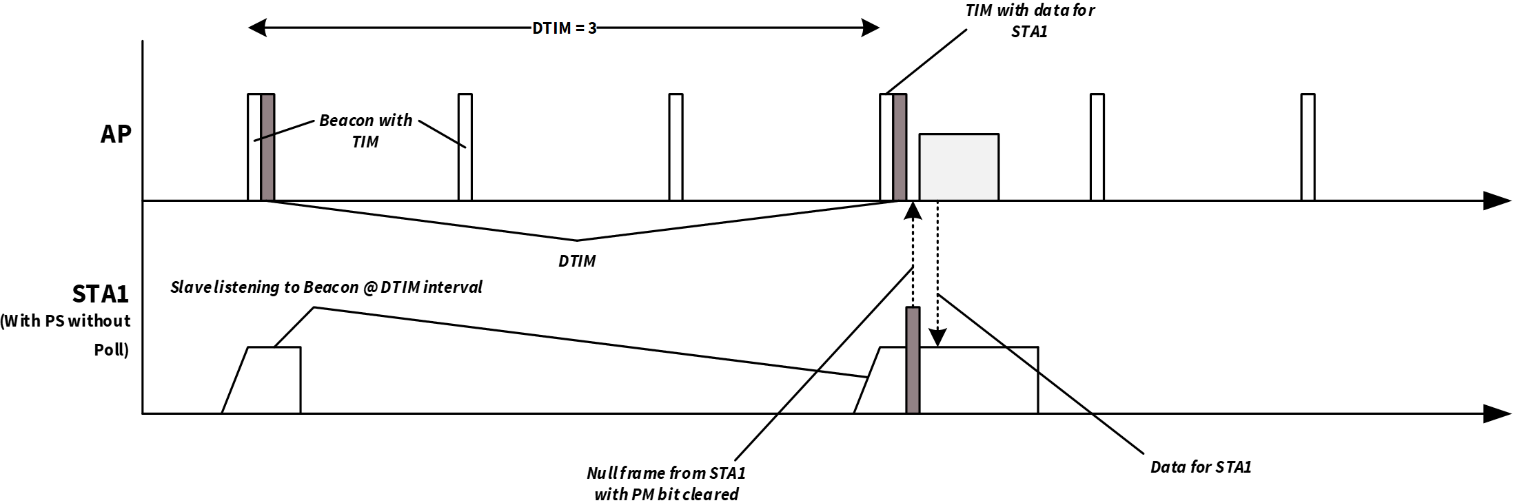 for details. In addition, each beacon includes a Traffic Indication Map (TIM) that contains information regarding packets buffered for STAs. It is the responsibility of the STAs to read the TIM and retrieve the packets destined for them.