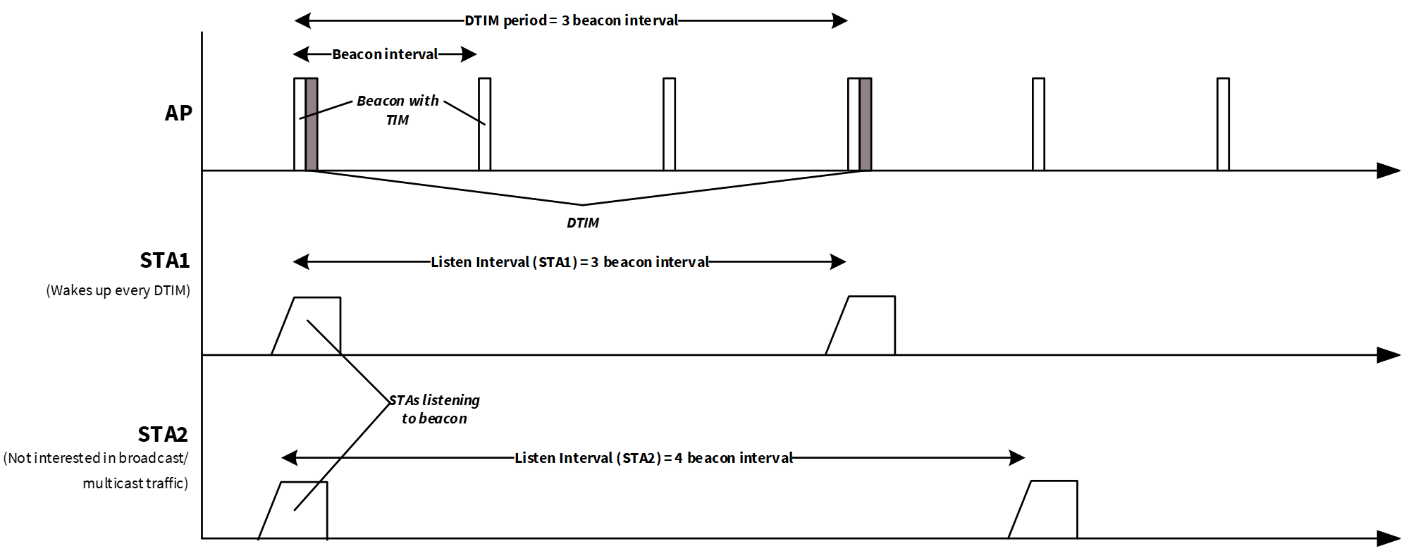 Note that the listen interval is recommended to be equal to (or less than) the DTIM period for the STA to receive all unicast, multicast, and broadcast packets. This ensures an optimal power and latency tradeoff.