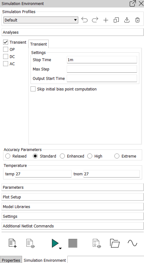 The parameters with which a simulation is performed are configured in the Simulation Environment view.